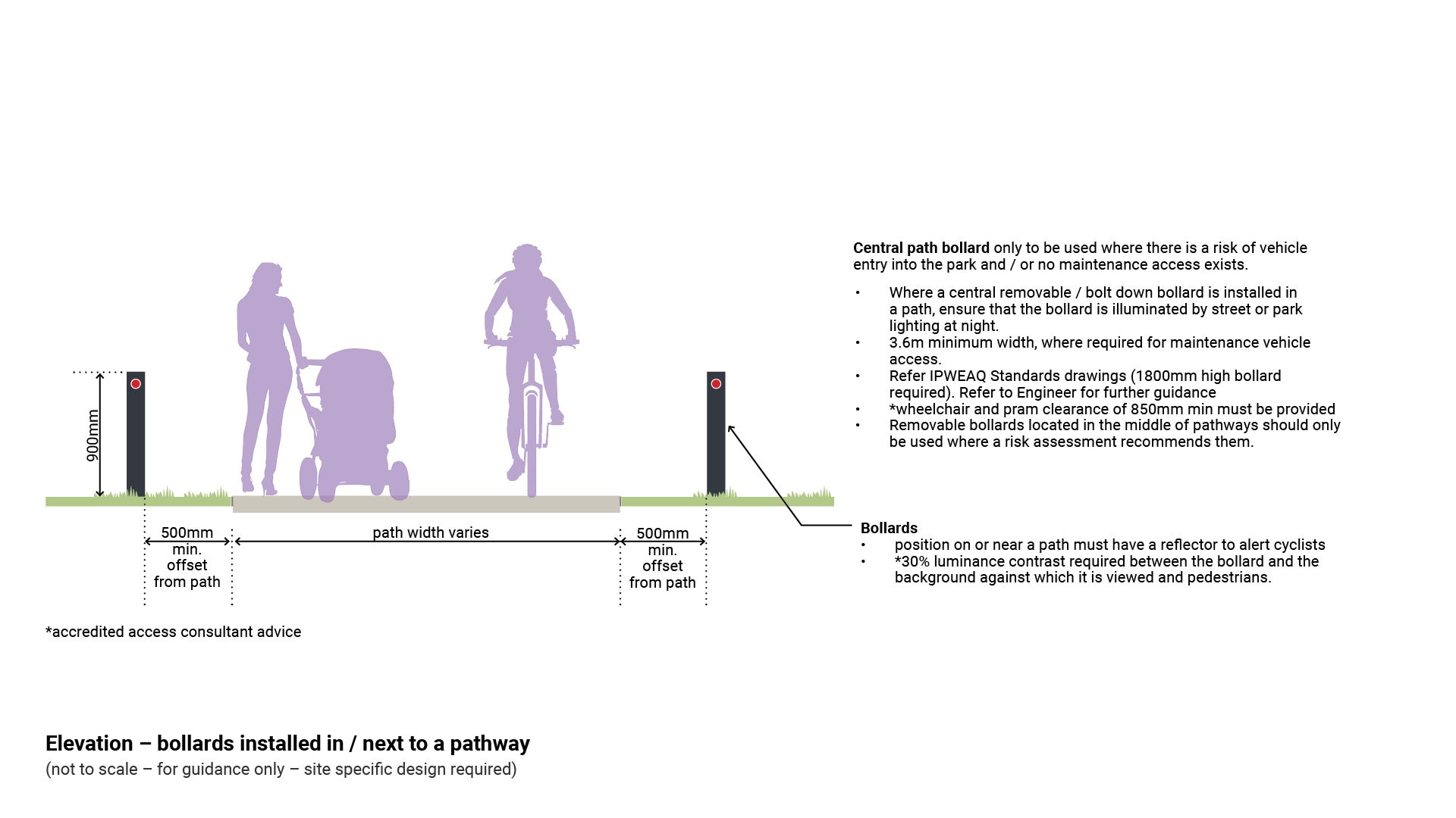 Bollard | Edge of path | 500 mm | For pedestrian and cyclist safety, comply with Austroads 500 mm min offset from path edge to any obstacle. |