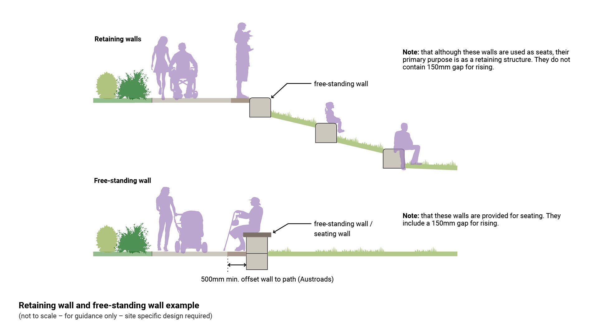 - Walls for seating should be smooth at the top, between 450 mm and 520 mm high for adults.