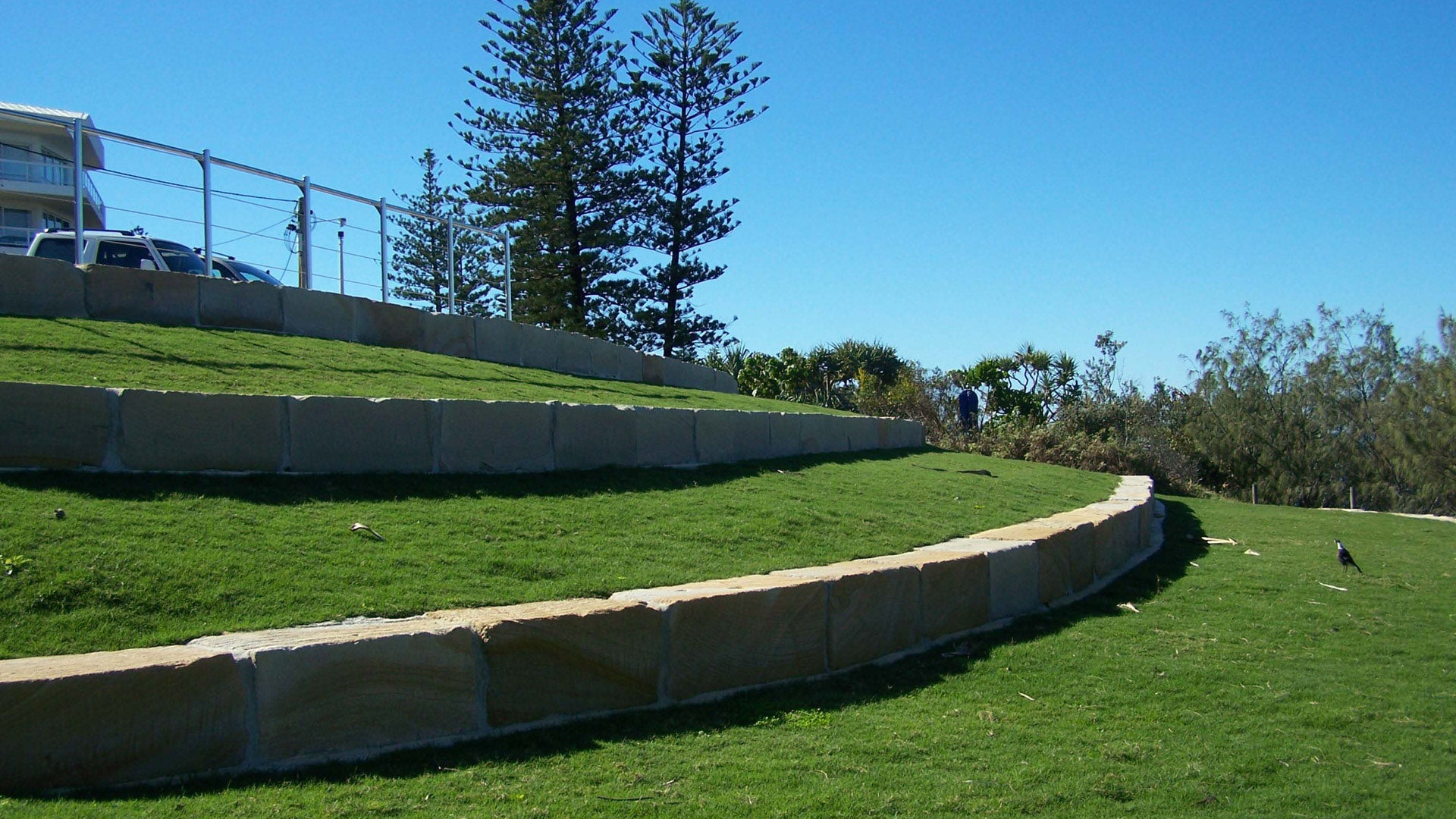 - Sandstone blocks requiring mechanical lifting. The excavator operator needs to be licensed, experienced, highly skilled, and capable of laying blocks so that the grain is predominantly horizontal, to ensure a natural look to the finished wall, and to resist weathering.