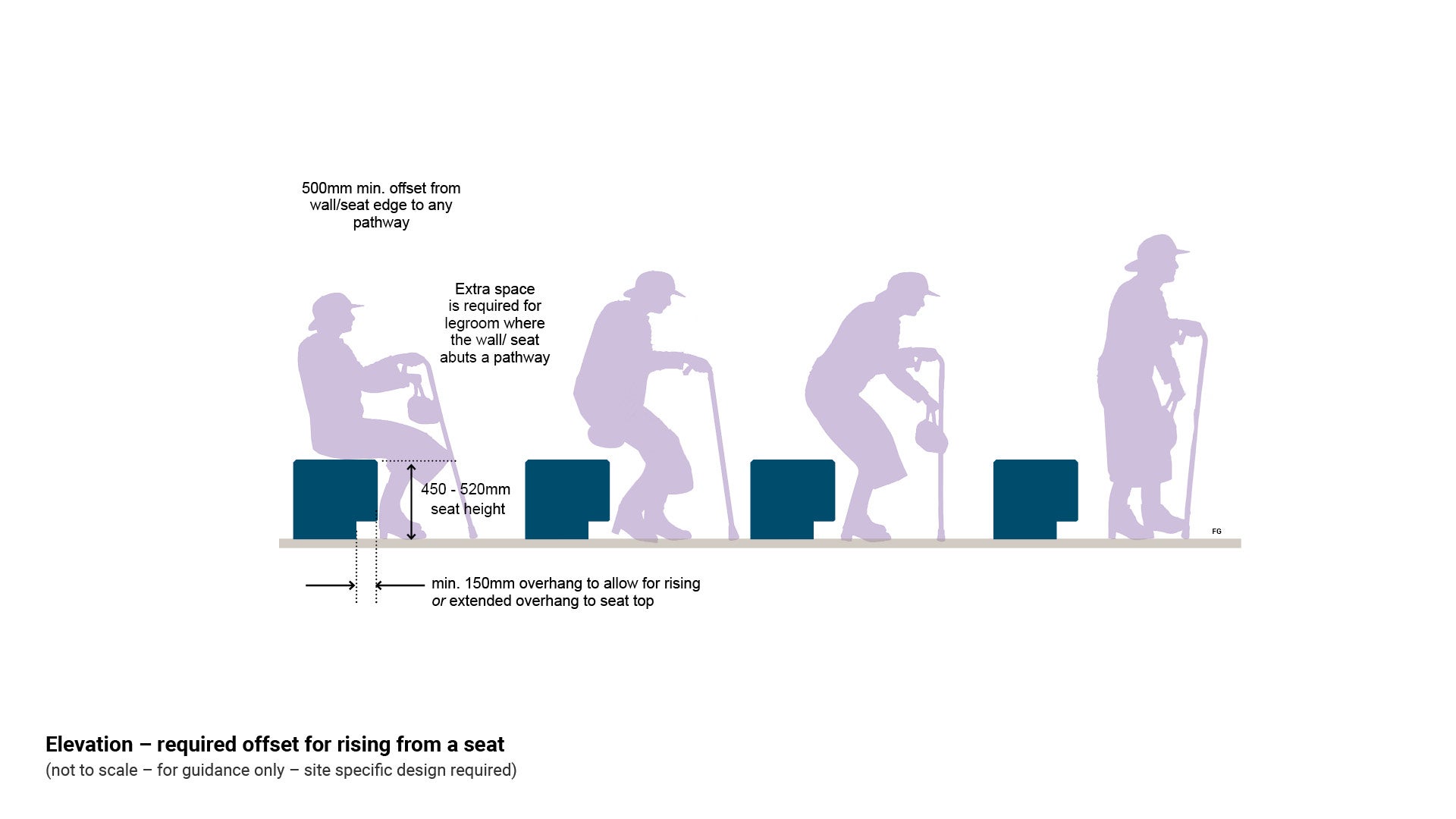 - Seating requires a 150 mm minimum gap from the front edge of the seat to the base of the seat (at ground level), to assist people to rise from a seated to a standing position. Install armrests to assist rising.