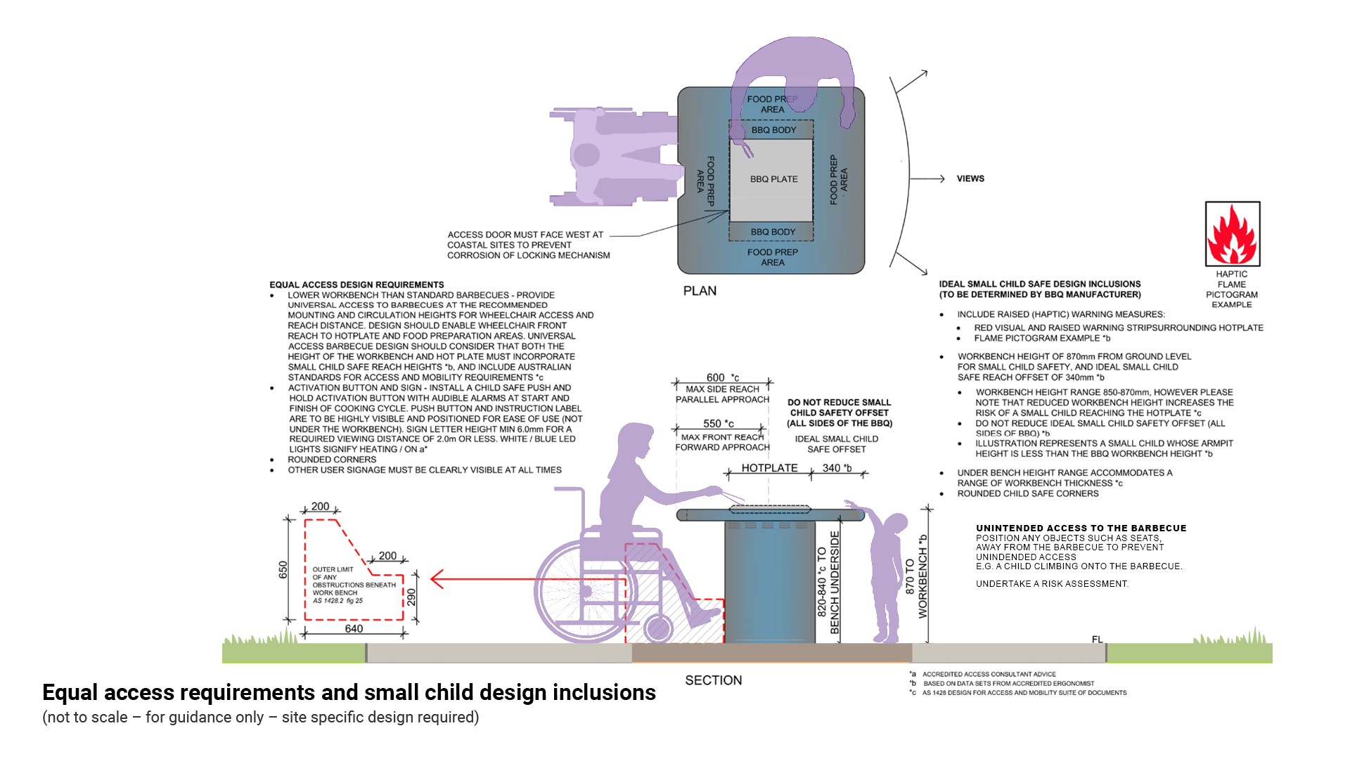 - Provide equal access to barbecues at the recommended mounting and circulation heights to provide wheelchair access and reach distance (include equal access to all associated embellishments).