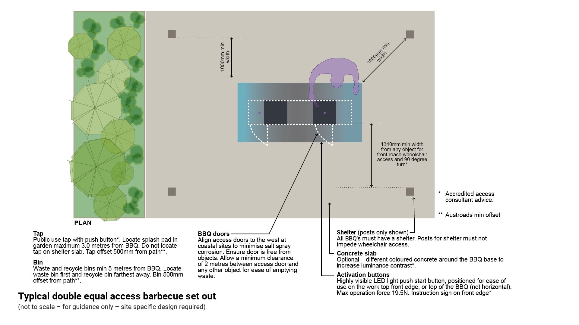 Barbecue | Shelter post | 1.0 m | For manoeuvrability and access to and around barbecue. |
