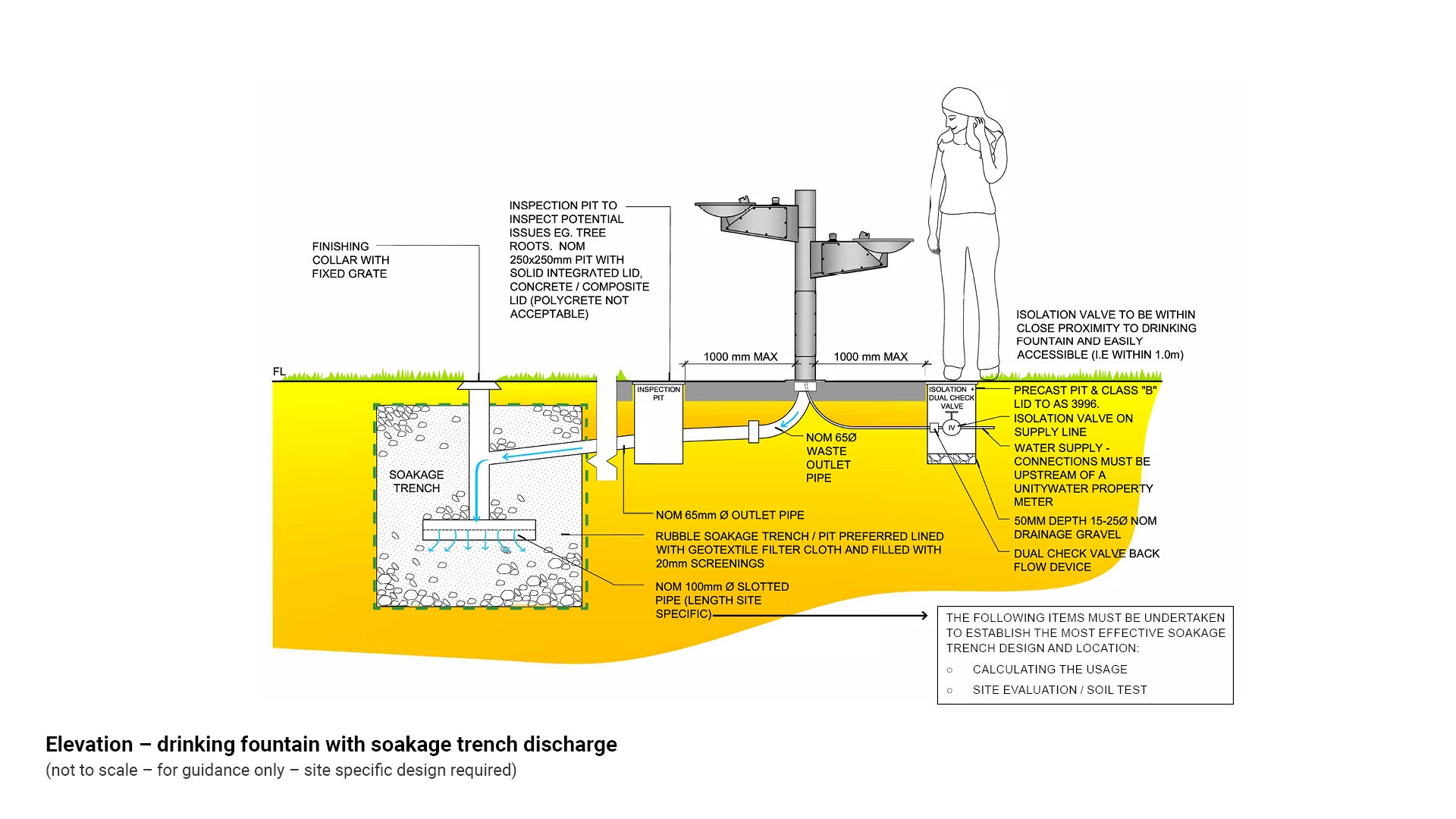 - see LIM Drinking fountains - Positioning for best practice soakage trench locations.