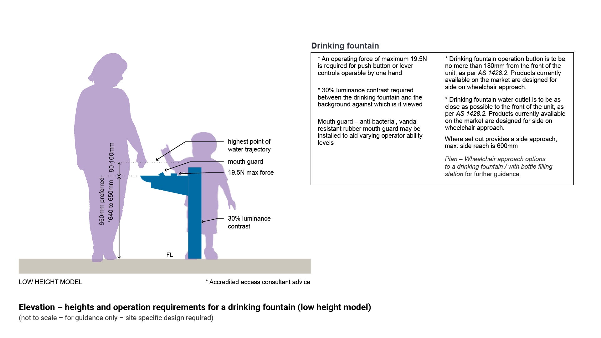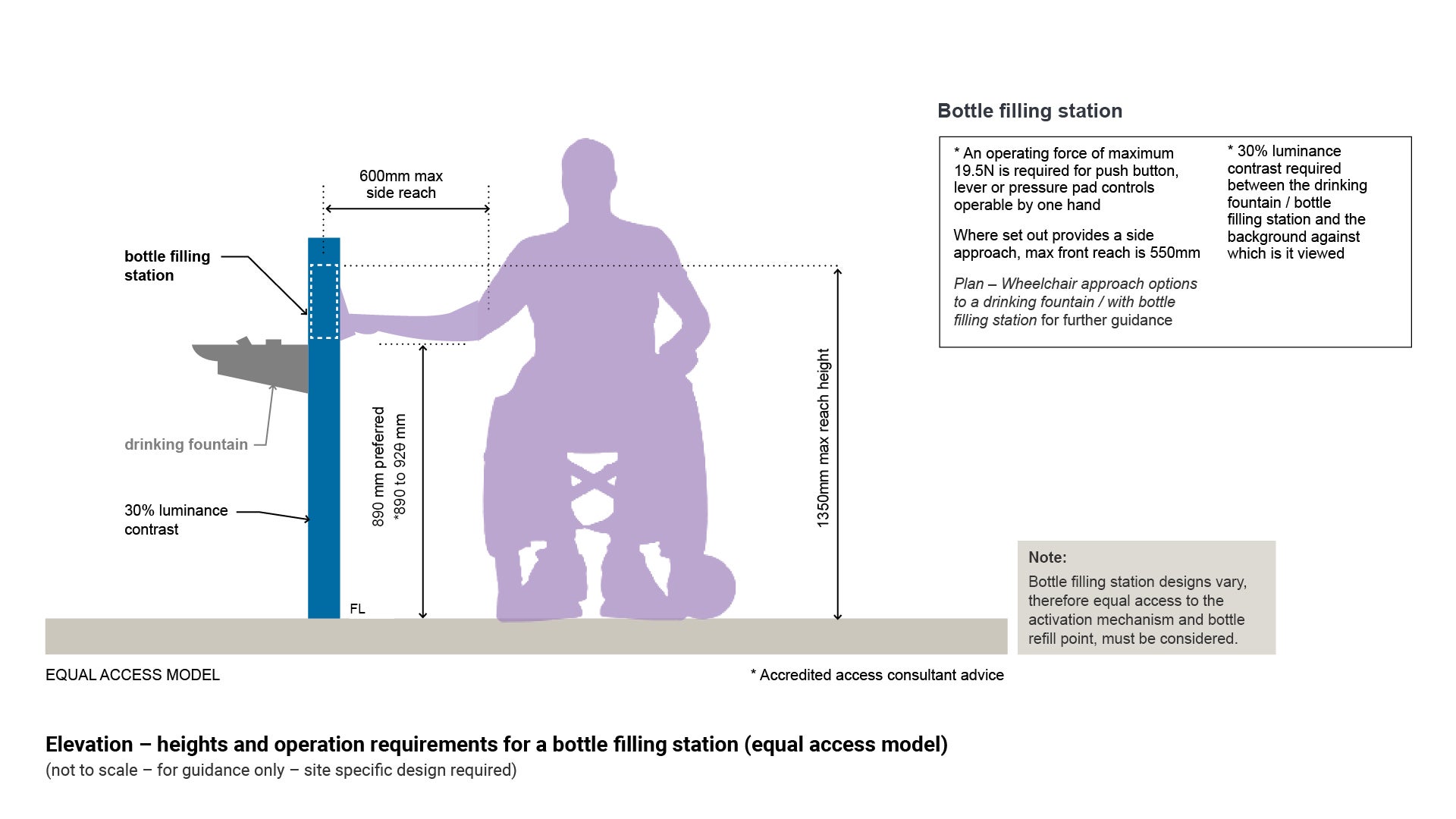 - note that where a dual height drinking fountain is installed it is preferred that a bottle filling station is not installed, as depending on the design, it may be difficult to access by a person using a wheelchair. See Table 4: Drinking fountain/bottle filling station preferred height and locations for further guidance.