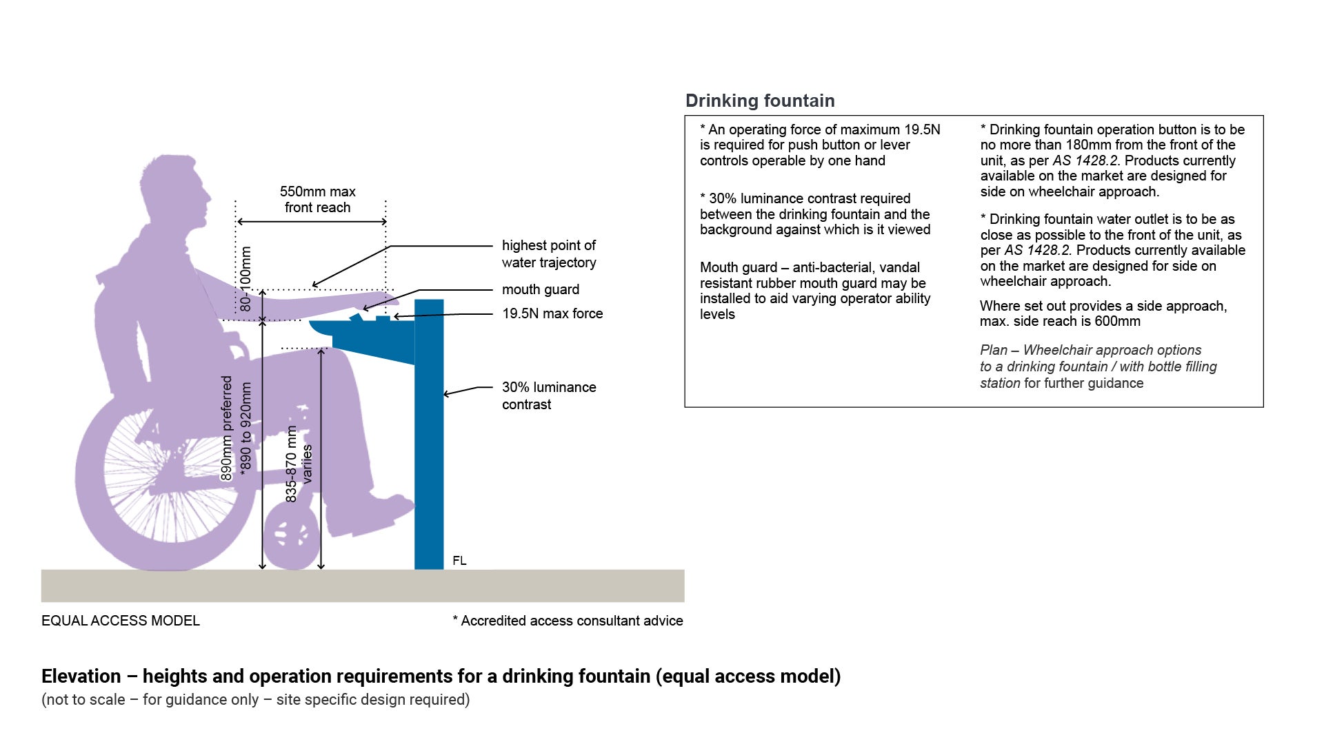 - Drinking fountains/bottle filling stations should be accessible from 180 degrees to cater for left and right handed people.