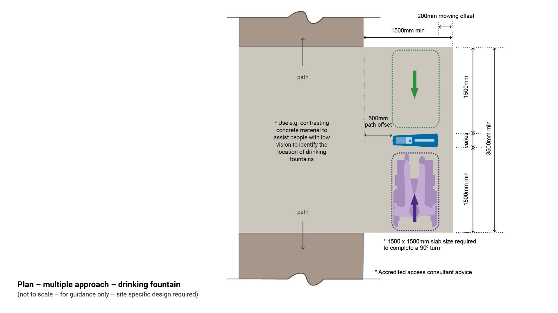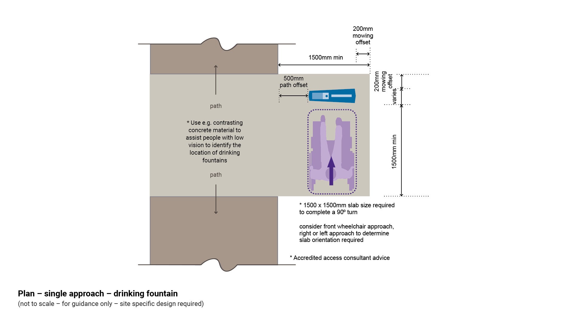 - If multiple drinking fountains are to be installed, the slab may be reduced in size. Preference is to provide approaches for both sides (allow 1500 mm x 1500 mm for a 90° turn) – for left and right hand wheelchair access.