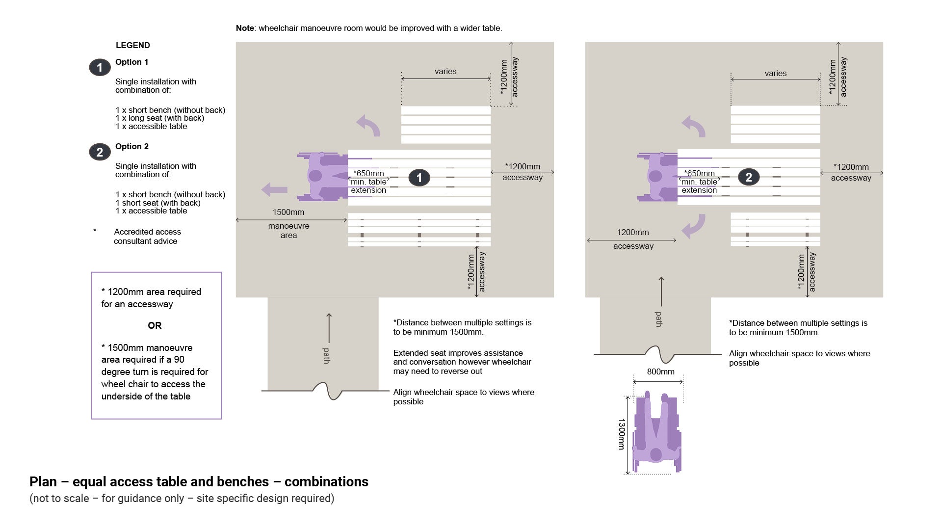 - Provide a selection of picnic table and bench combinations that cater for a diverse population. Parents with prams and wheelchair users can benefit from being located centrally to improve assistance and conversation with other users.