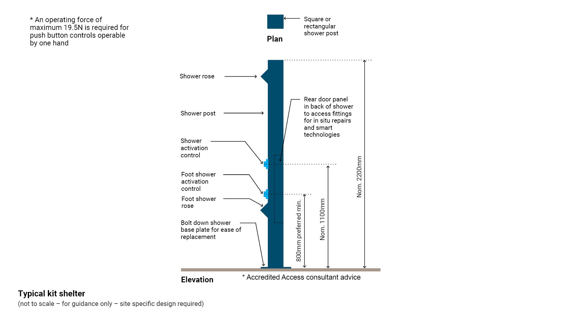 - Provision is to be made for the installation of smart technologies e.g.water use sensor (100 mm x 100 mm x 100 mm) and internal plumbing to the inside of the shower unit. Recommended 135 mm x 135 mm or greater post size. This counter is designed to collect data and will aid in the asset management, maintenance and servicing of the shower.