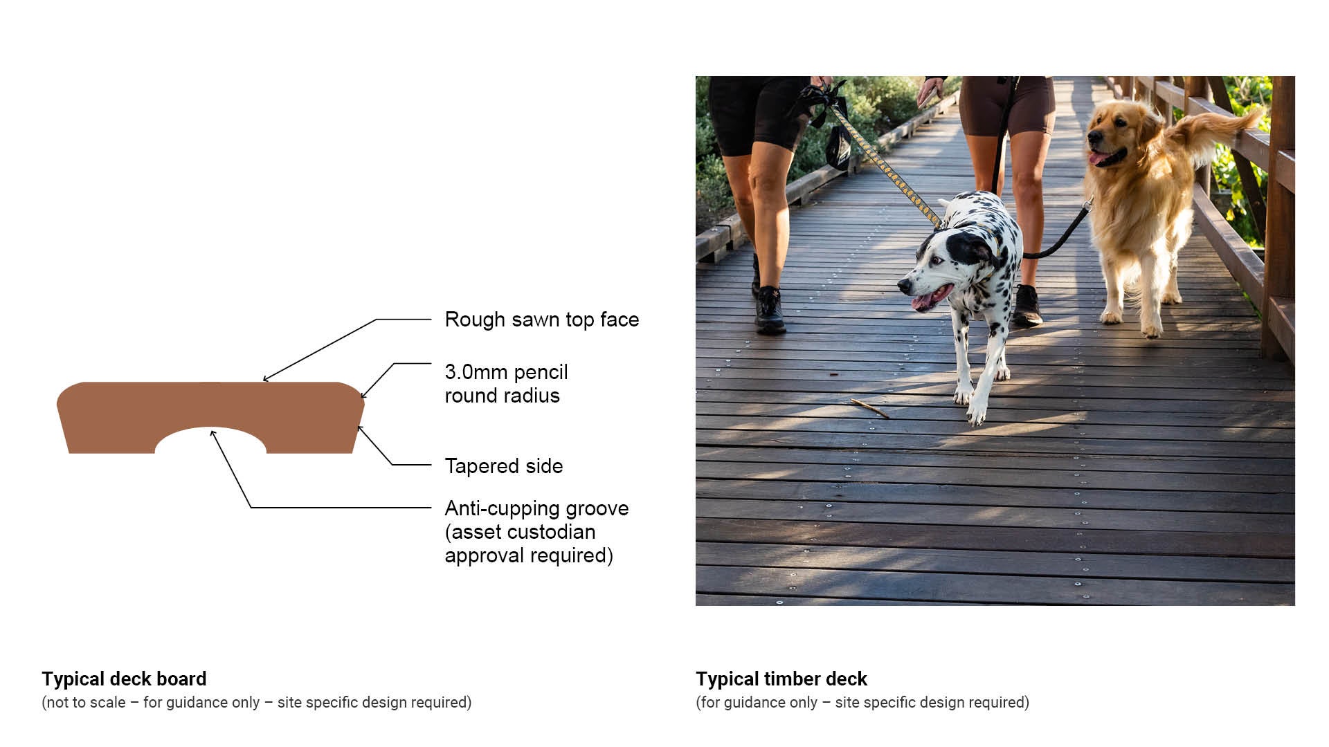 - Decking boards are to have 3.0 mm arris or pencil round to top edges, and tapered sides.