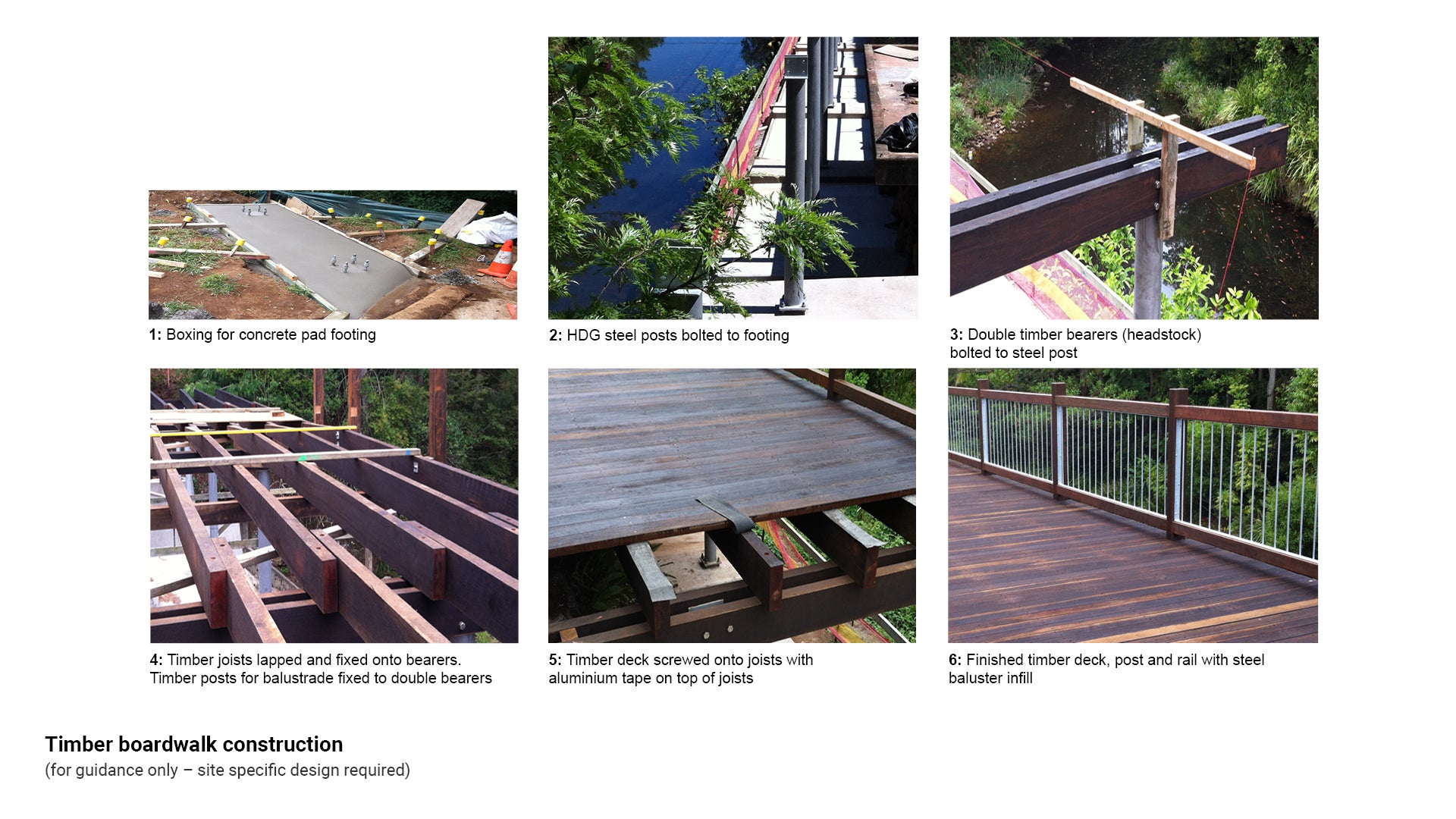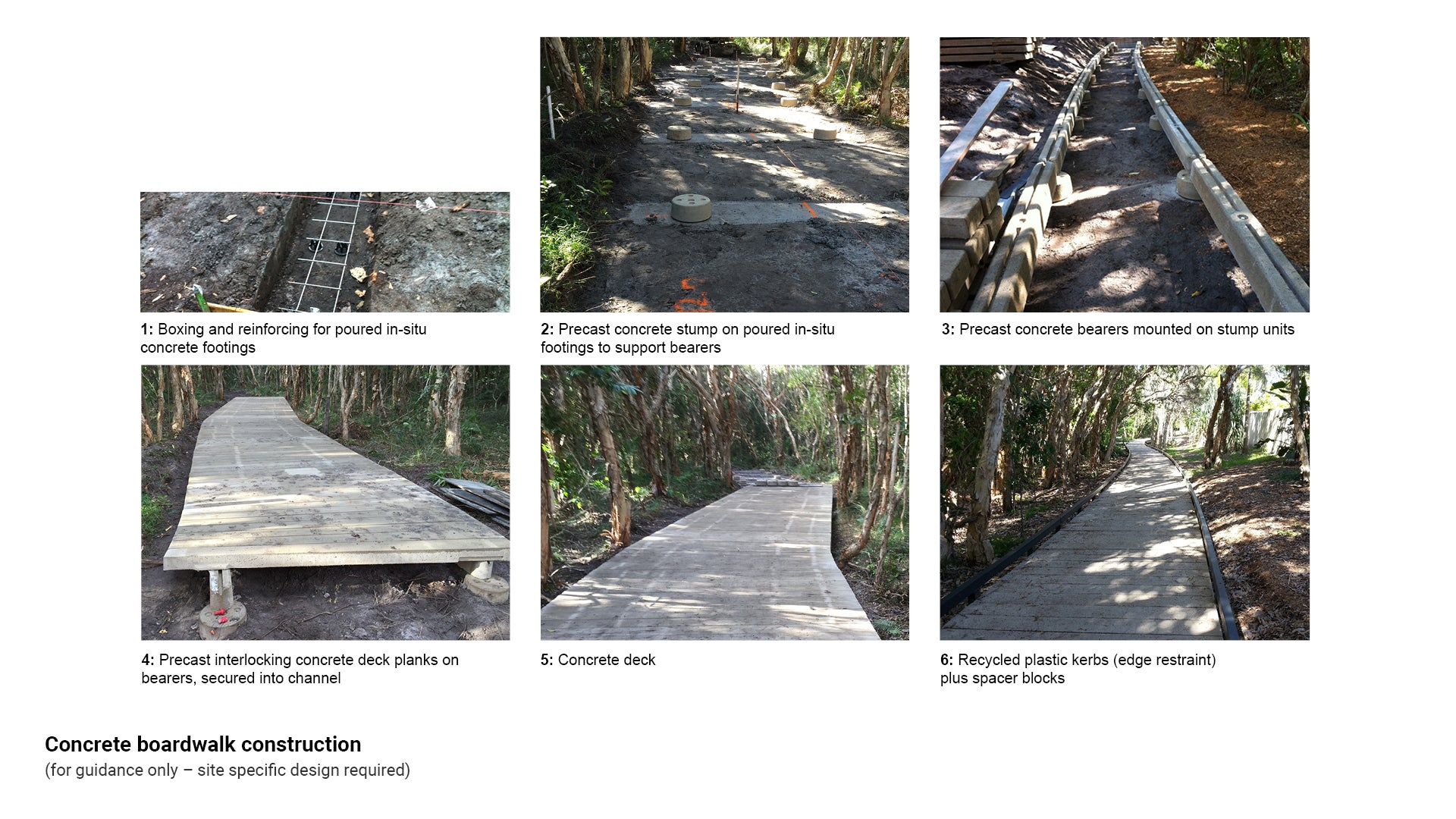 This section provides best practise examples of construction sequences of boardwalks and or viewing platforms using preferred materials; timber, pre-cast concrete and fibre reinforced plastic (FRP).