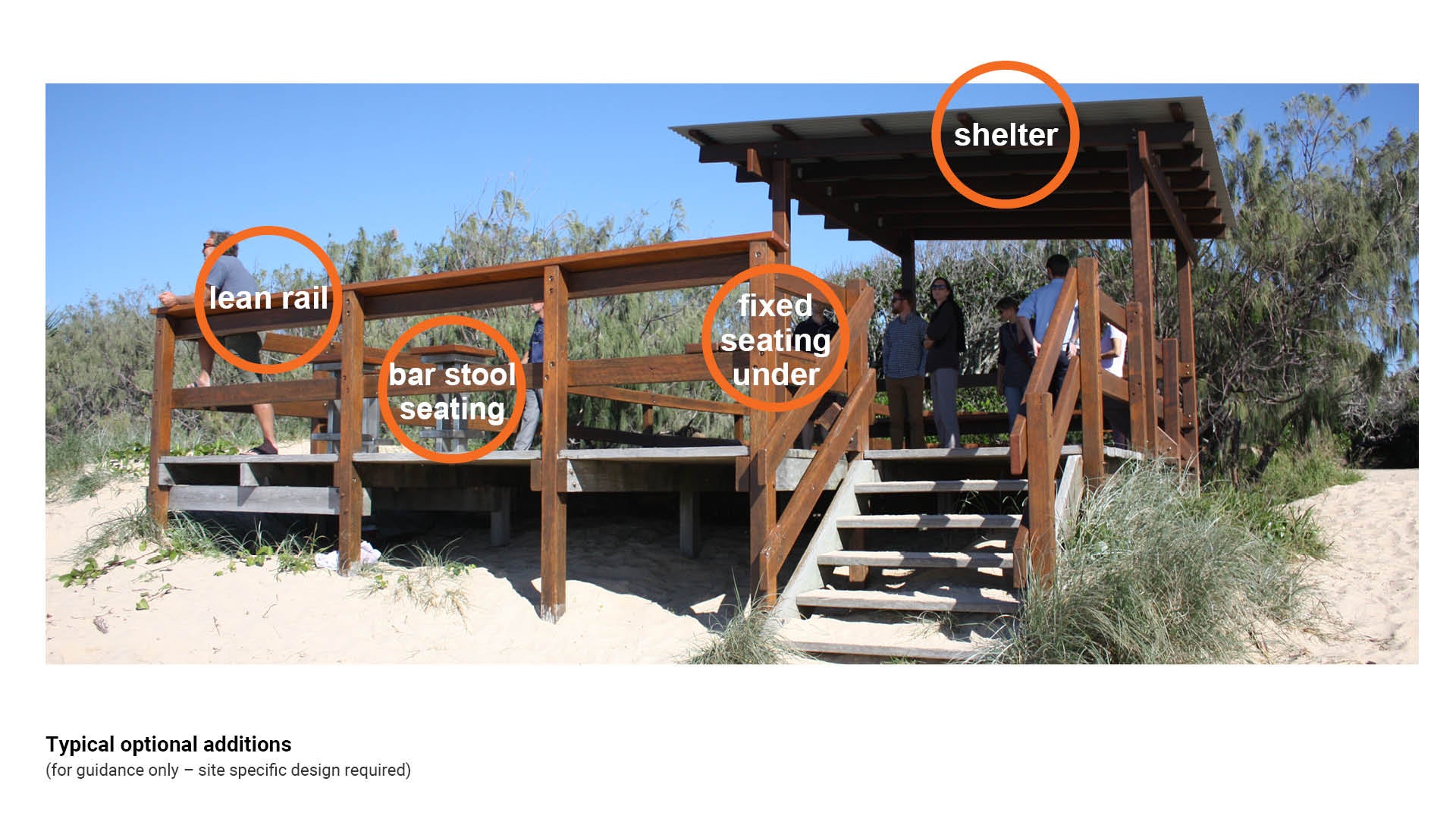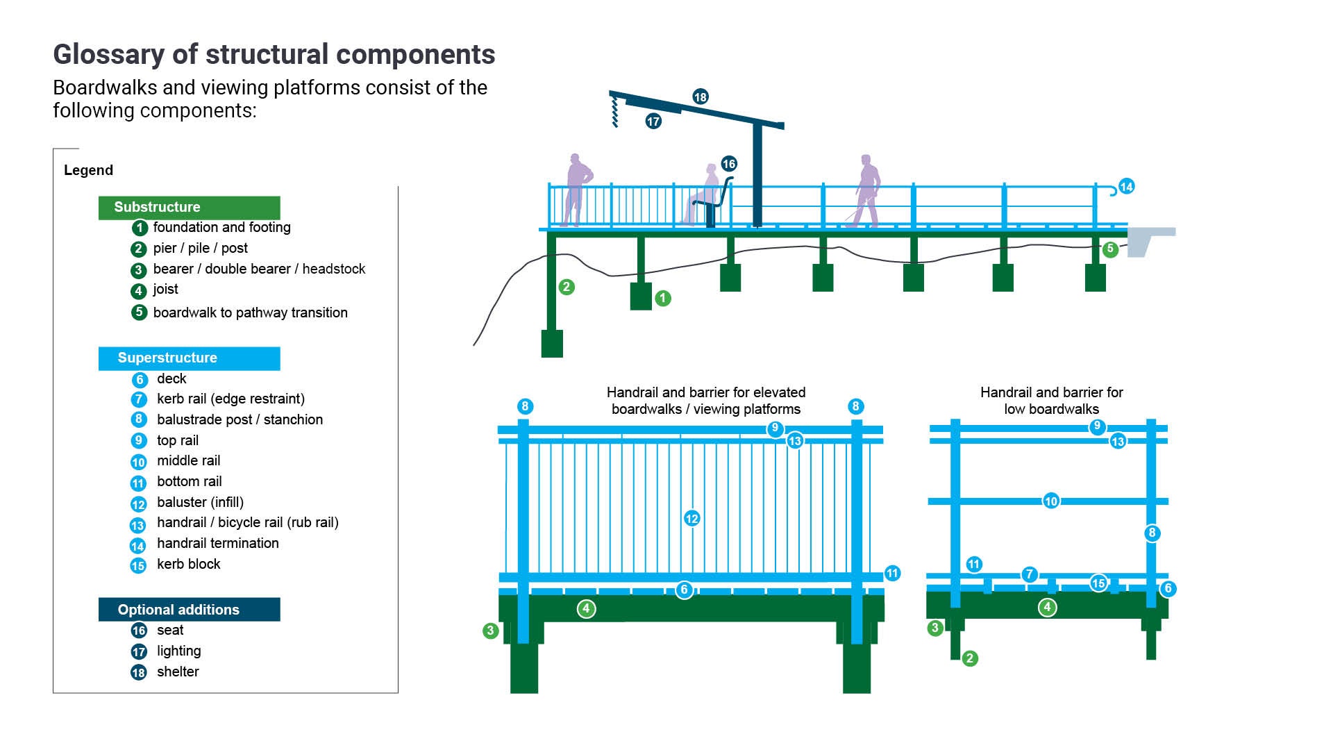 Optional additions (ancillary embellishments) are integrated into the boardwalk and/or viewing platform to provide functional enhancements and improve overall user experience. See Figure 8: Typical optional additions for an example.