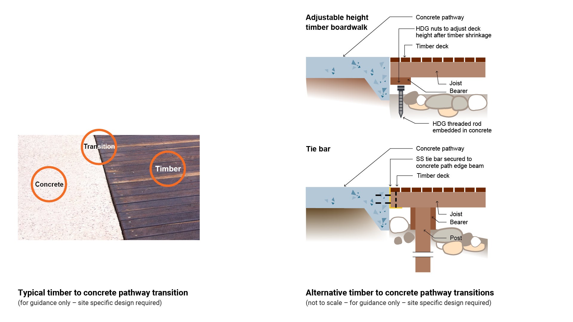 Timber boardwalks superstructure elements are selected for ease of materials supply and natural appearance.