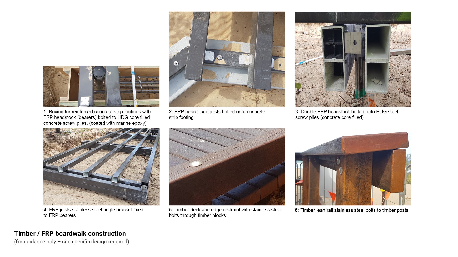 Fibre reinforced plastic (FRP) substructure is constructed, above ground level on steel tube core filled epoxy coated piers or set in concrete footings. The timber superstructure is constructed next. See Figure 11: Timber/FRP boardwalk.