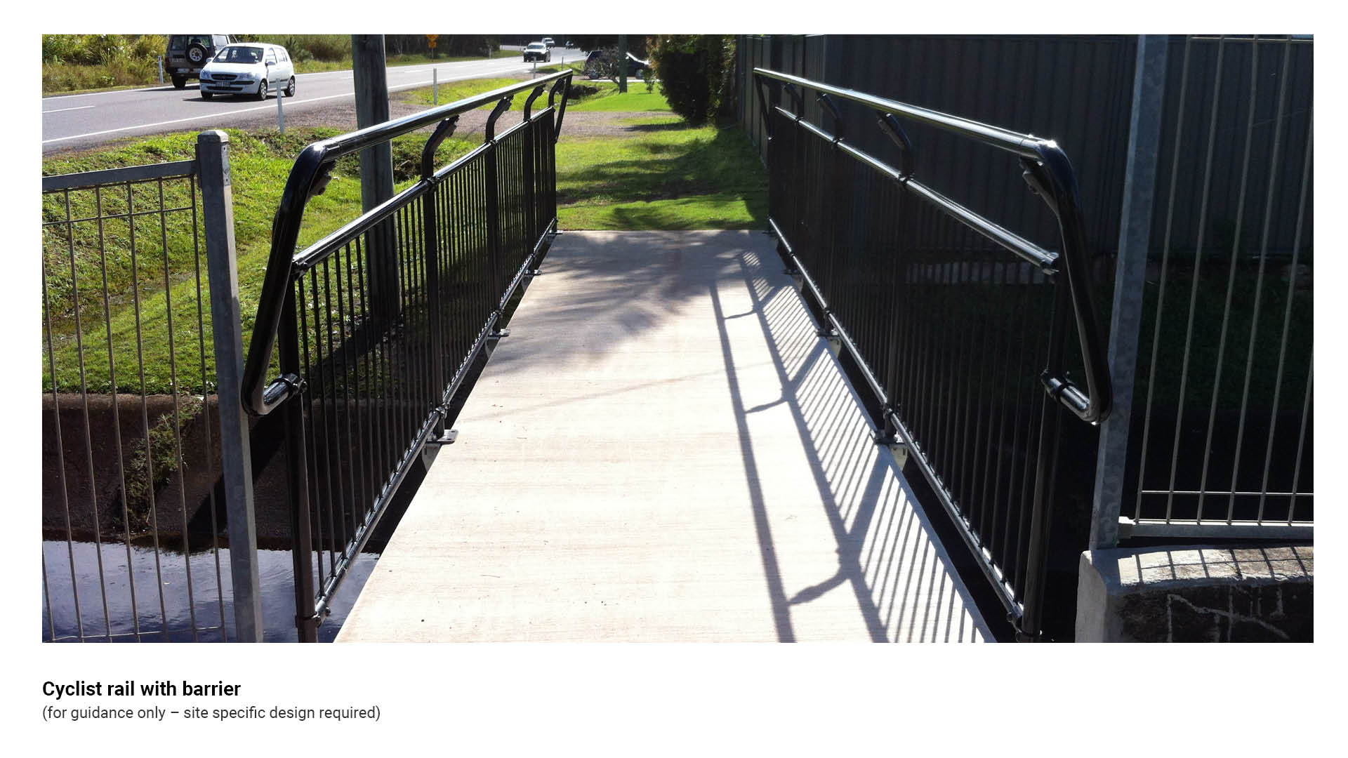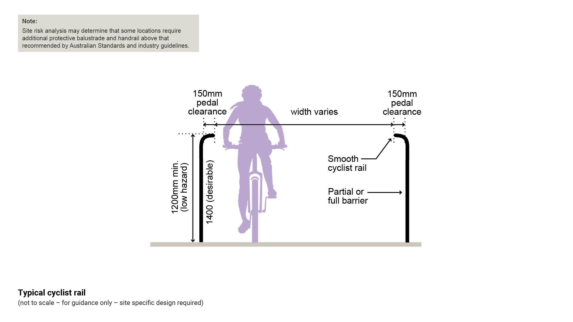 Note: Cyclist rail adjacent to a road or in a clear zone is to comply with Austroads Guide to Road Design Part 6A: Paths for Walking and Cycling.