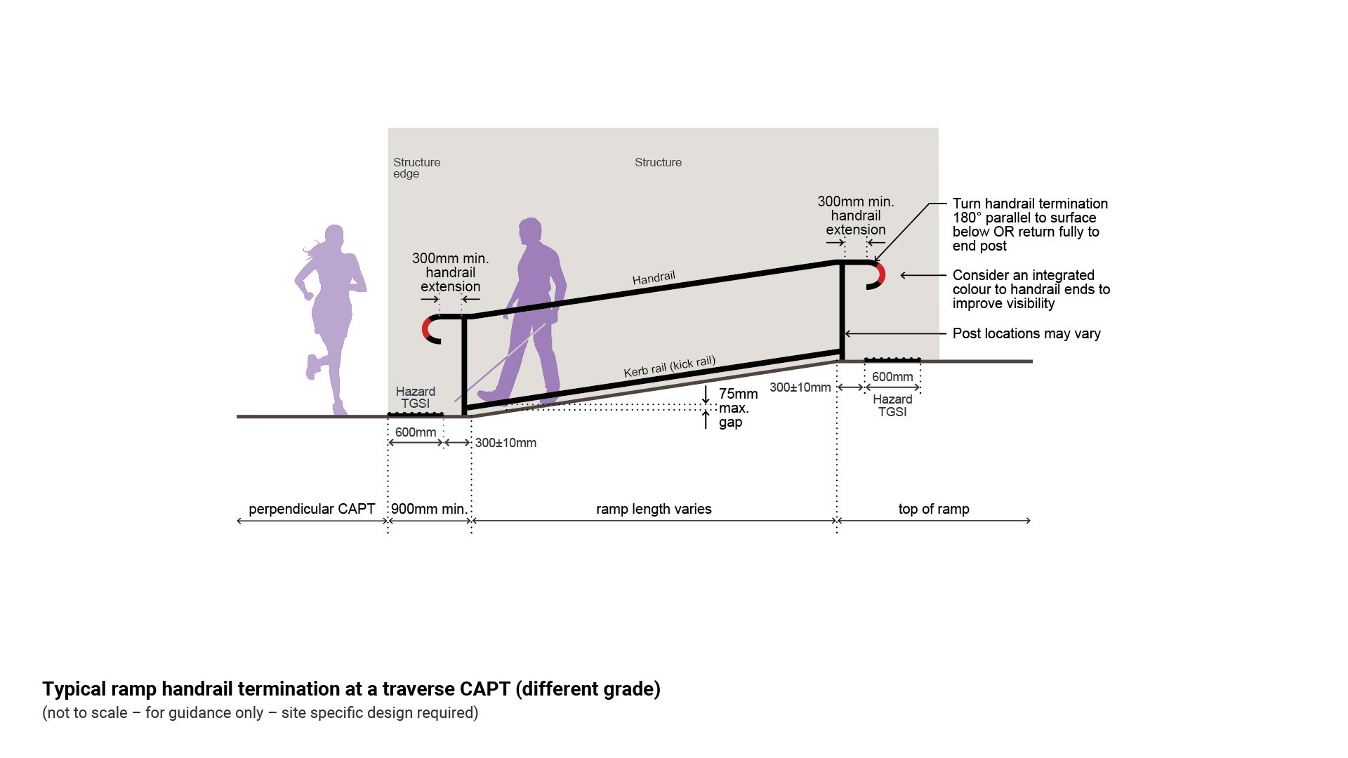 Pedestrian ramp handrail return clearance to CAPT (where the ramp is at a different grade to the path). | Traverse path of travel | 900 mm | For pedestrian/cyclist safety |