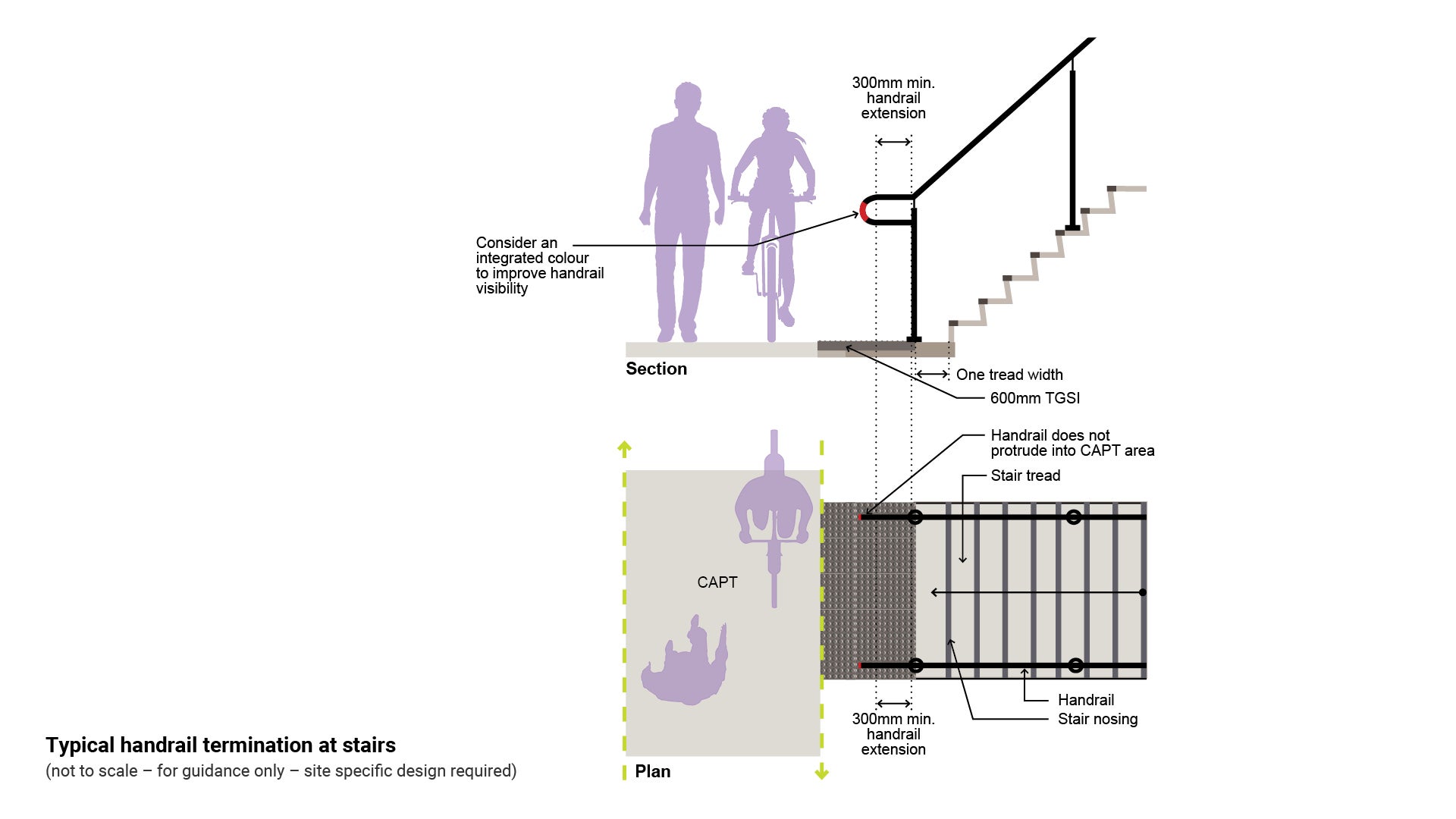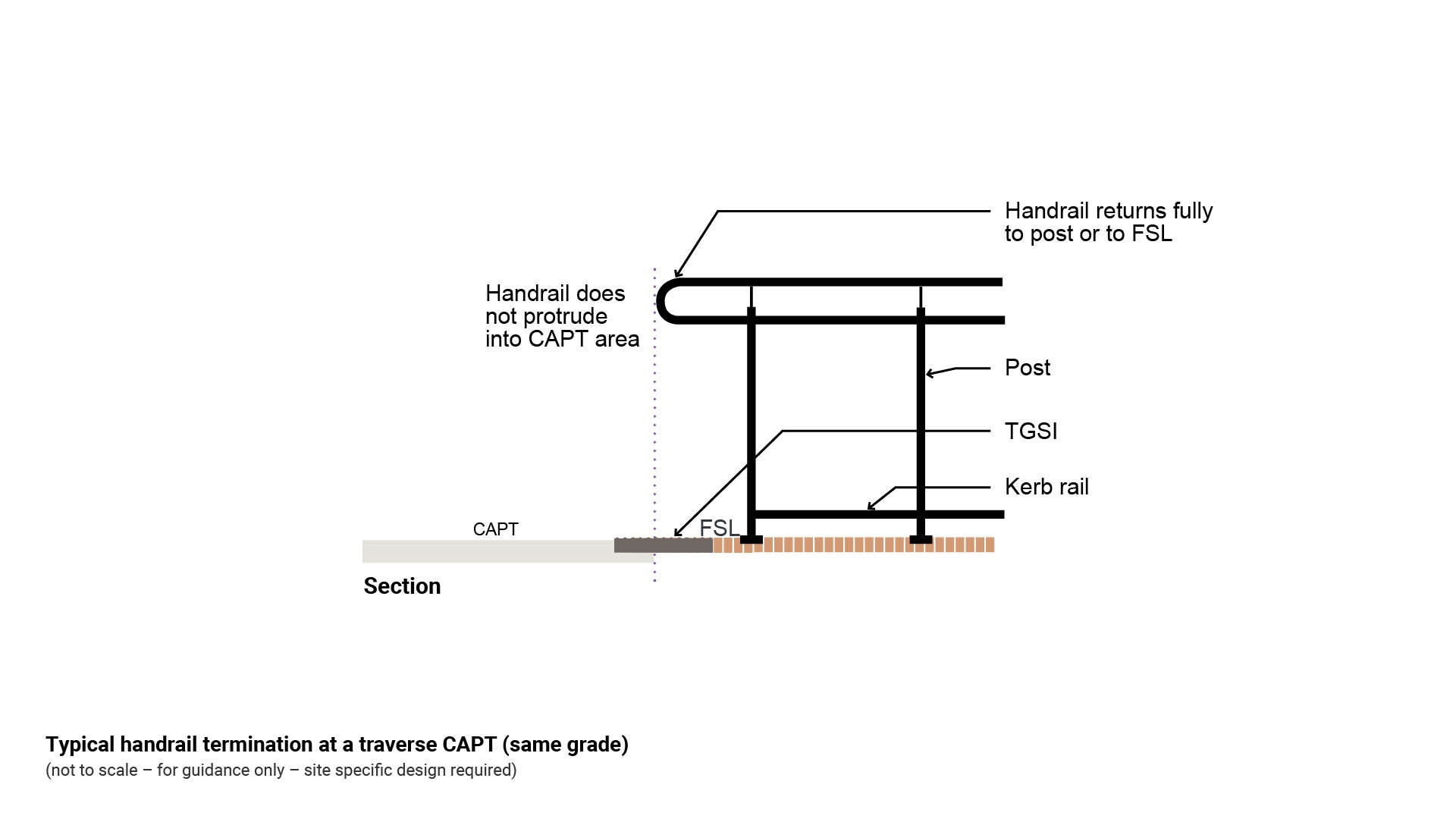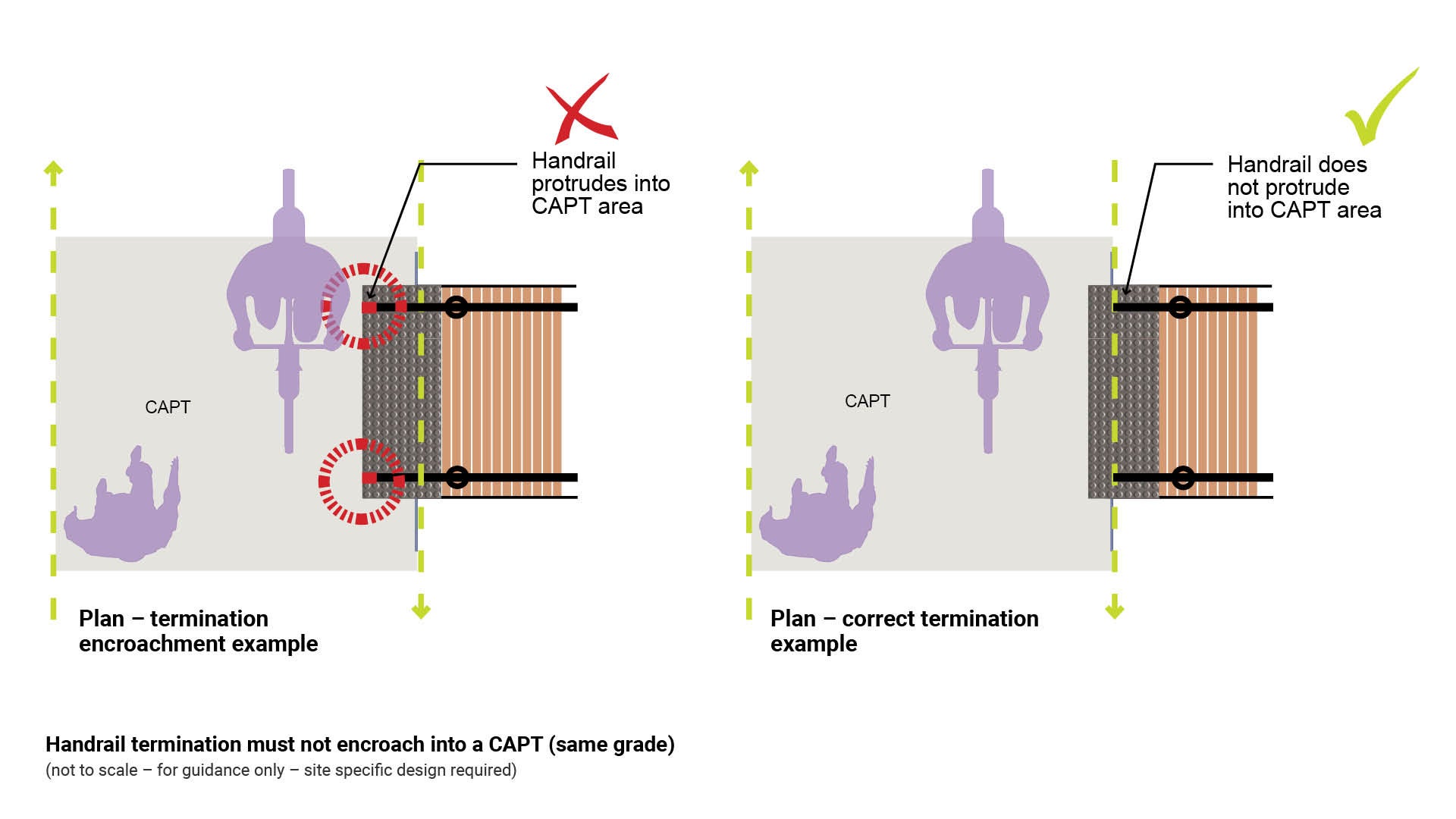 - The handrail return must not encroach into the connecting CAPT to minimise risk to pedestrians.