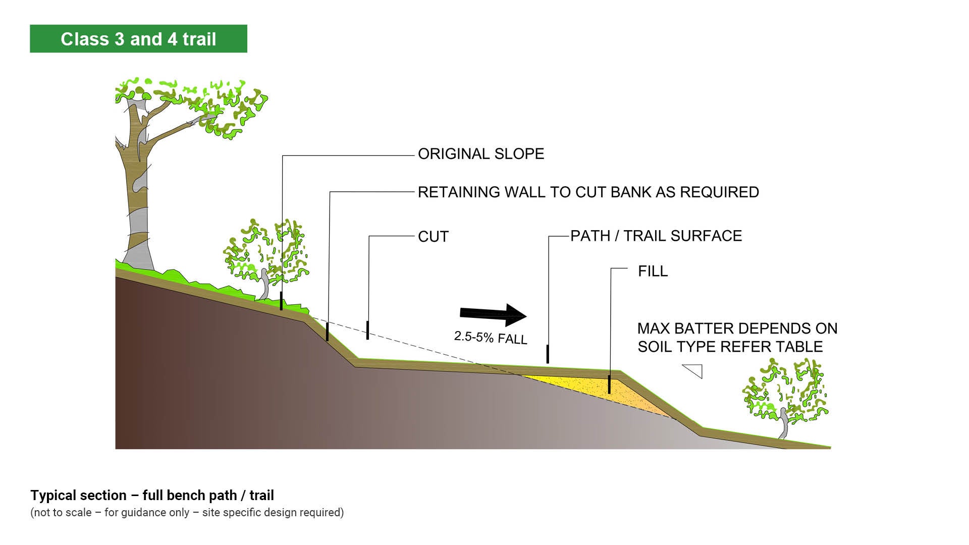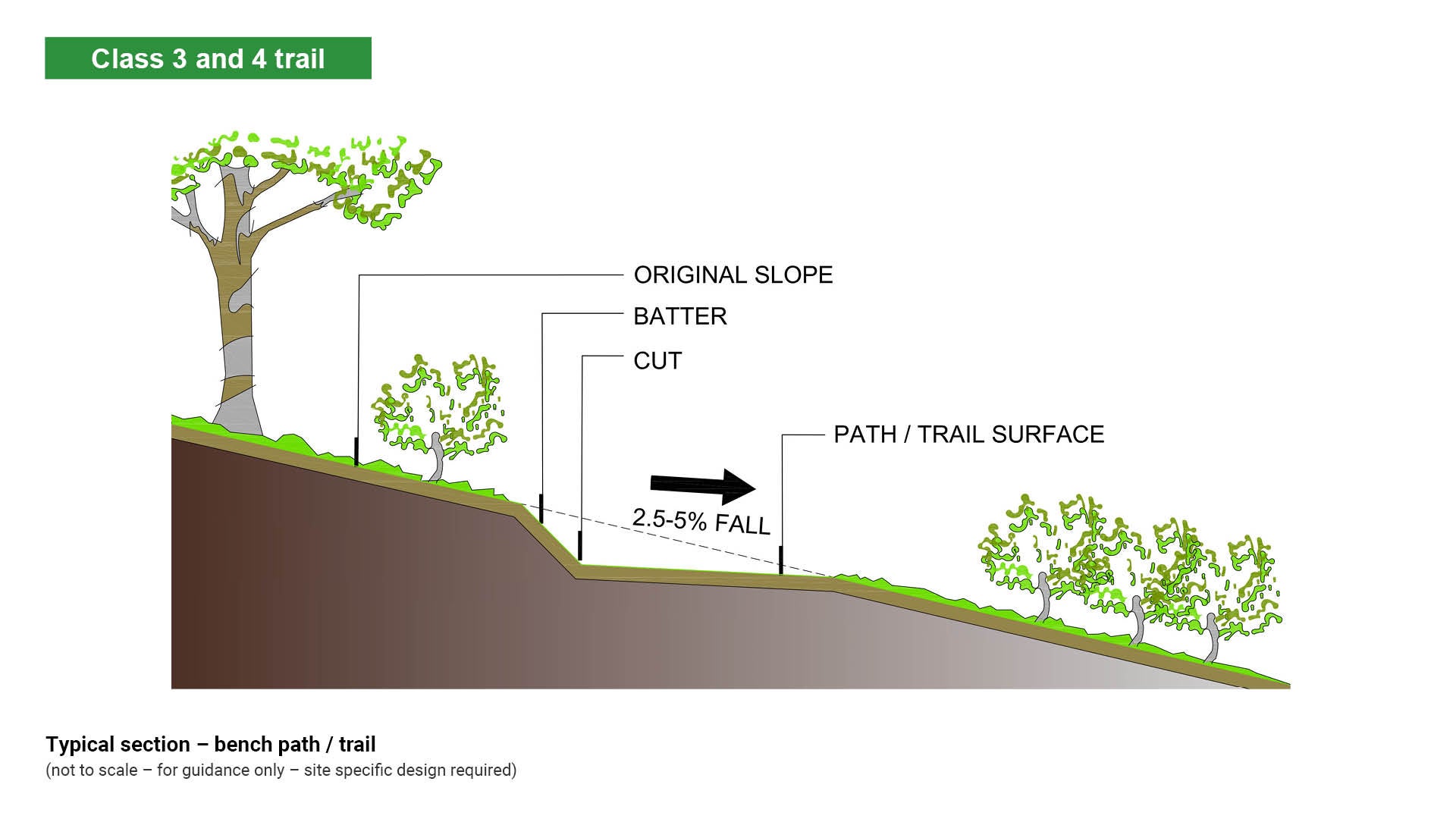 - On sloping ground, the path/trail tread should have a cross fall of 2.5% to 5% in the direction of the fall line. This is critical to assist in sheeting of water across the path/trail.