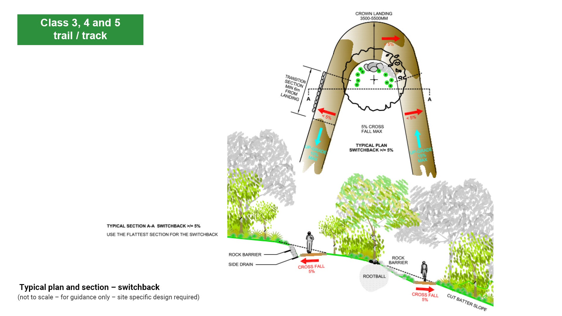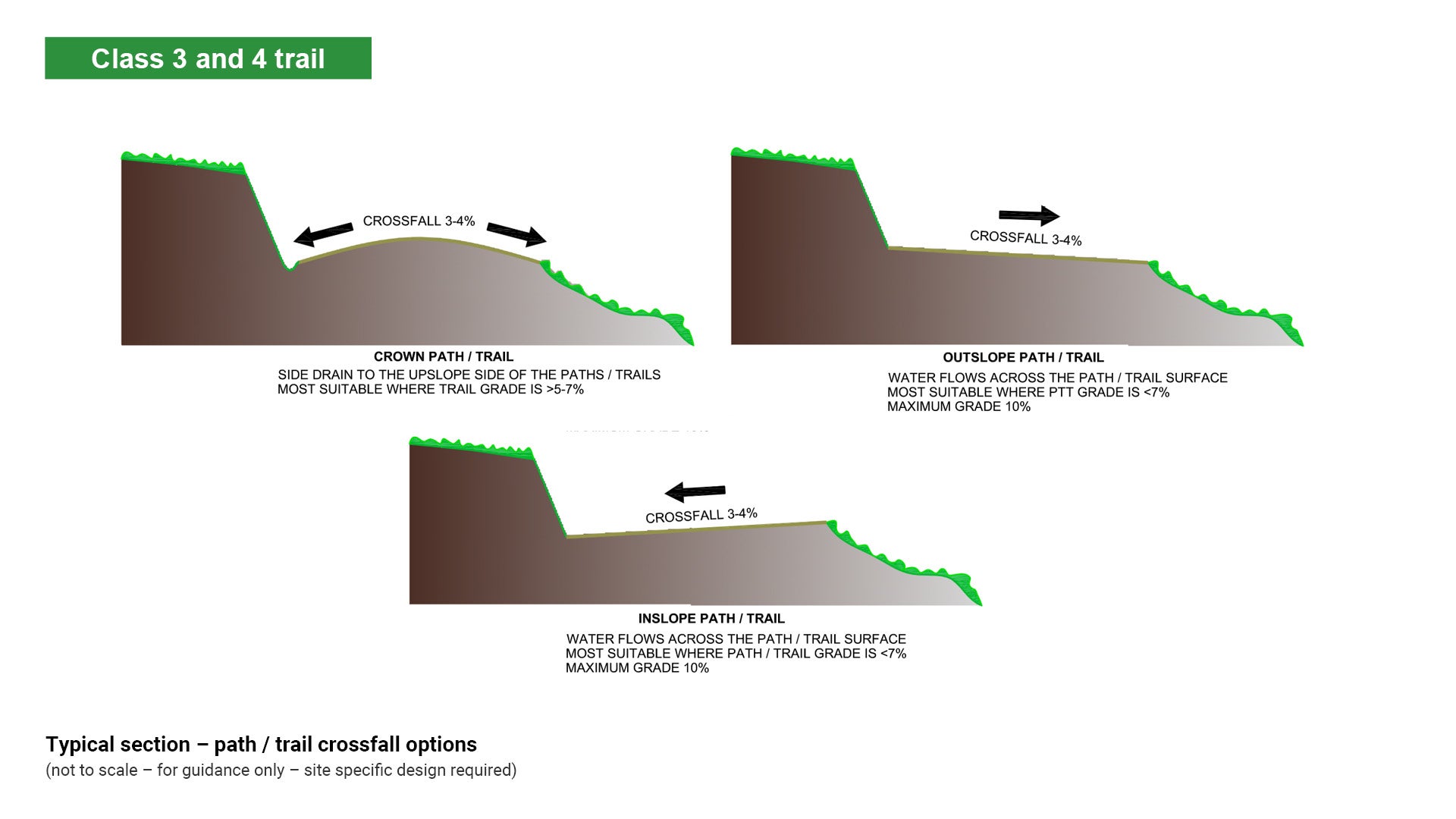 - Upper path/trail cross-fall is aligned uphill (with side drain) and lower path/trail cross-fall is aligned downhill.