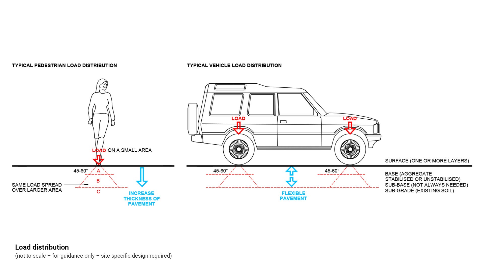 - Rigid (concrete), flexible (asphalt), unsealed (gravels) or stabilised gravel pavements are designed for thickness and compaction to suit the existing soil load bearing characteristics as determined by soil test results.