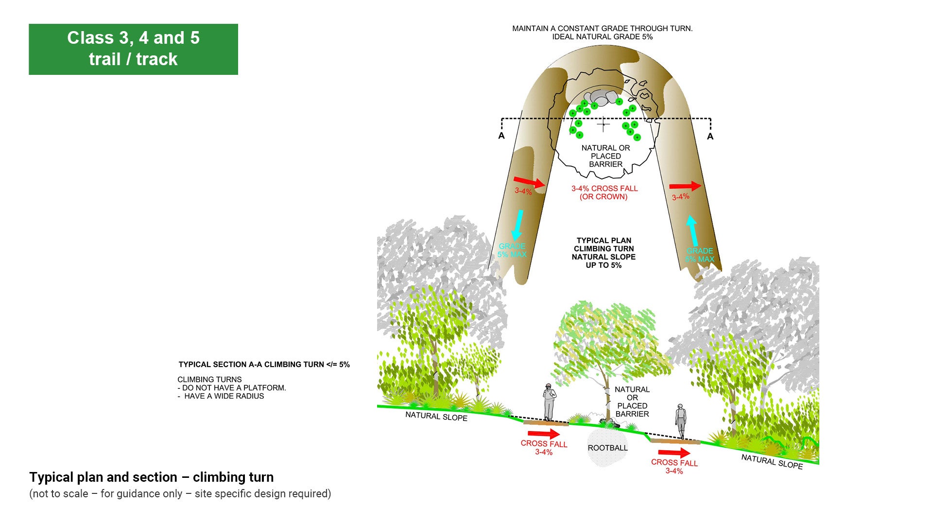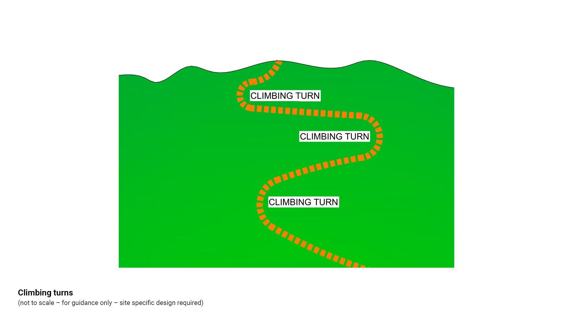 A climbing turn is built on the slope surface and where it turns, it climbs at the same rate as the slope. Climbing turns are incorporated into a path/trail alignment where it is necessary to gain elevation up a hill, in a relatively short distance.