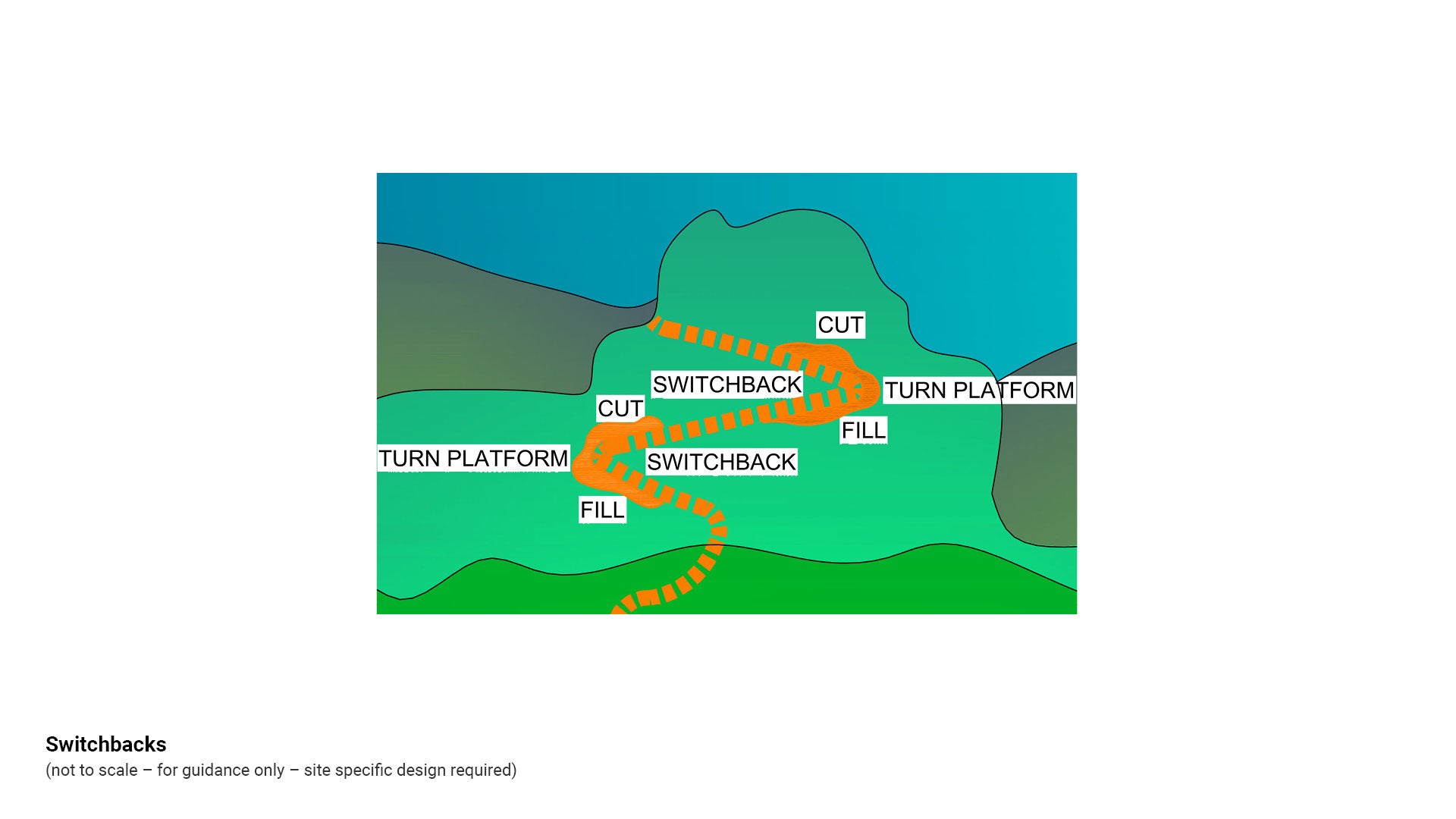 - Switchbacks should have a smooth turning radius (1.5 m-3.0 m) and barriers (natural if possible) between the arms of the turn to prevent shortcuts.