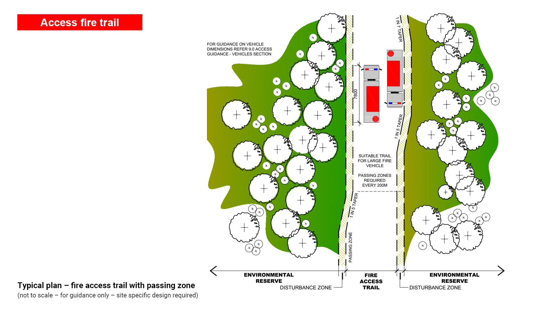 - Passing bays are required at a minimum of every 200 m along the fire access trail. Turnaround areas are required where through access is not possible.
