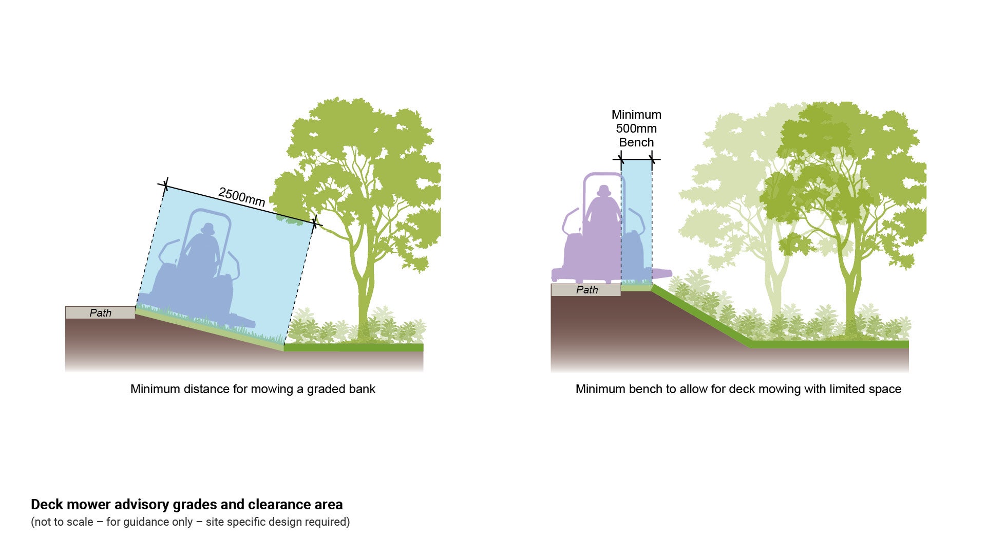 - 2.5 m clear area is required (where possible) beside a pathway, where a turfed area will require mowing. Deck mowers widths vary (generally 2.0 m wide), chute may fold/remove.