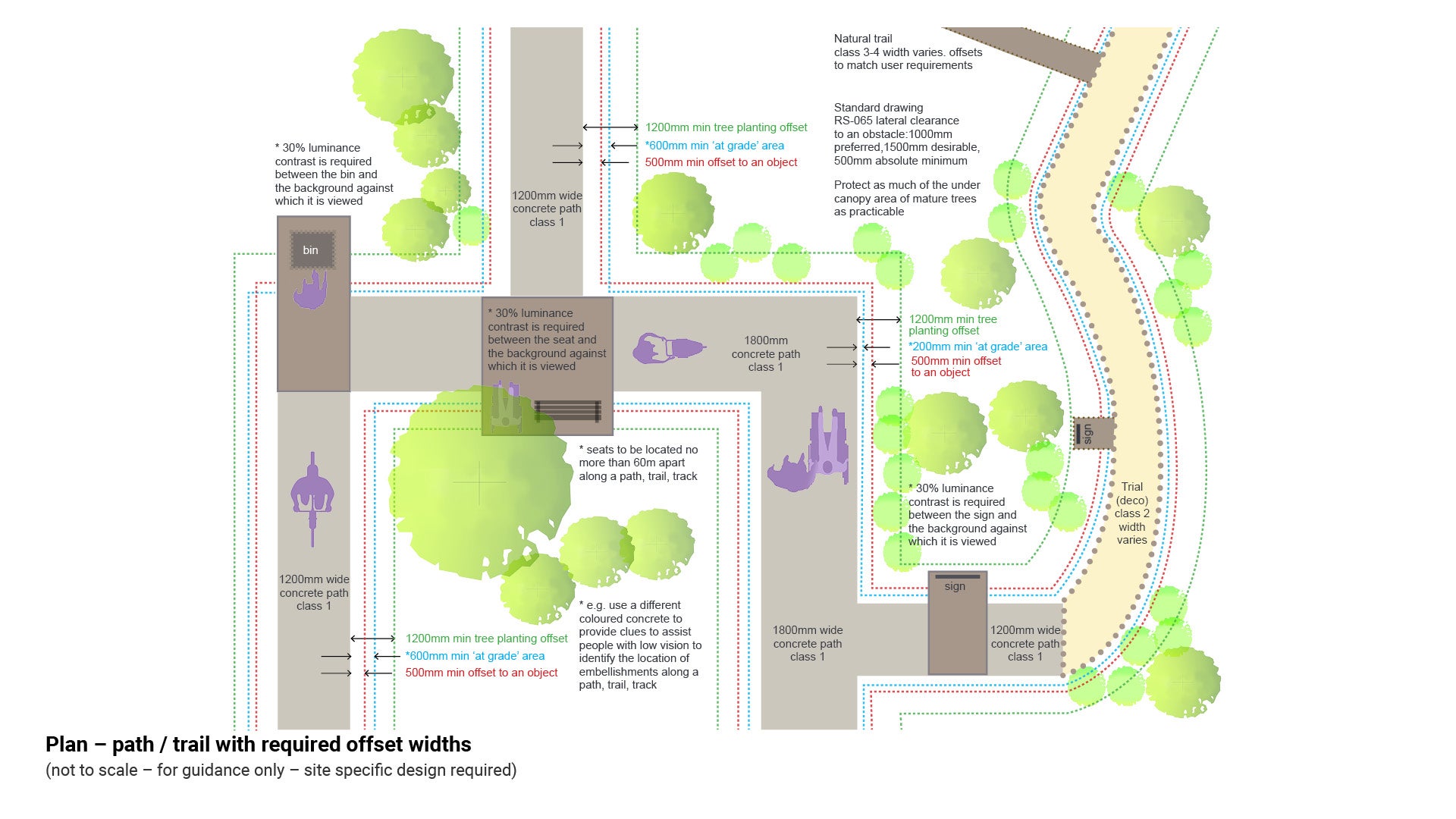 Seats | Seats | 60 m (max distance) | install seats no more than 60 m apart along the lineal path/trail to create rest intervals as per AS 1428.1. Useful for designs for older people and injured people |