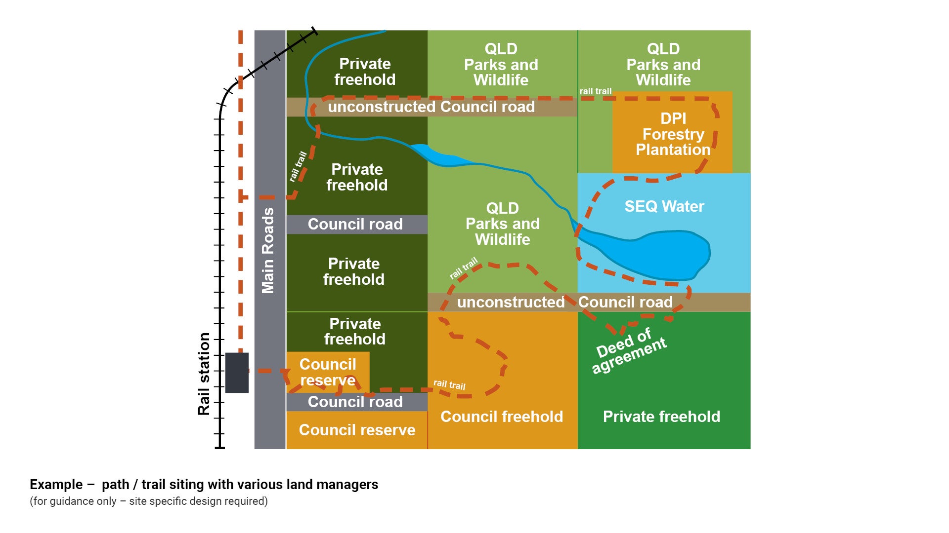 The alignment of a path/trail may traverse through various parcels of land which are controlled by various land managers (e.g. adjoining landholders, state controlled land or council controlled land). See Figure 1: Example – path/trail siting with various land managers.