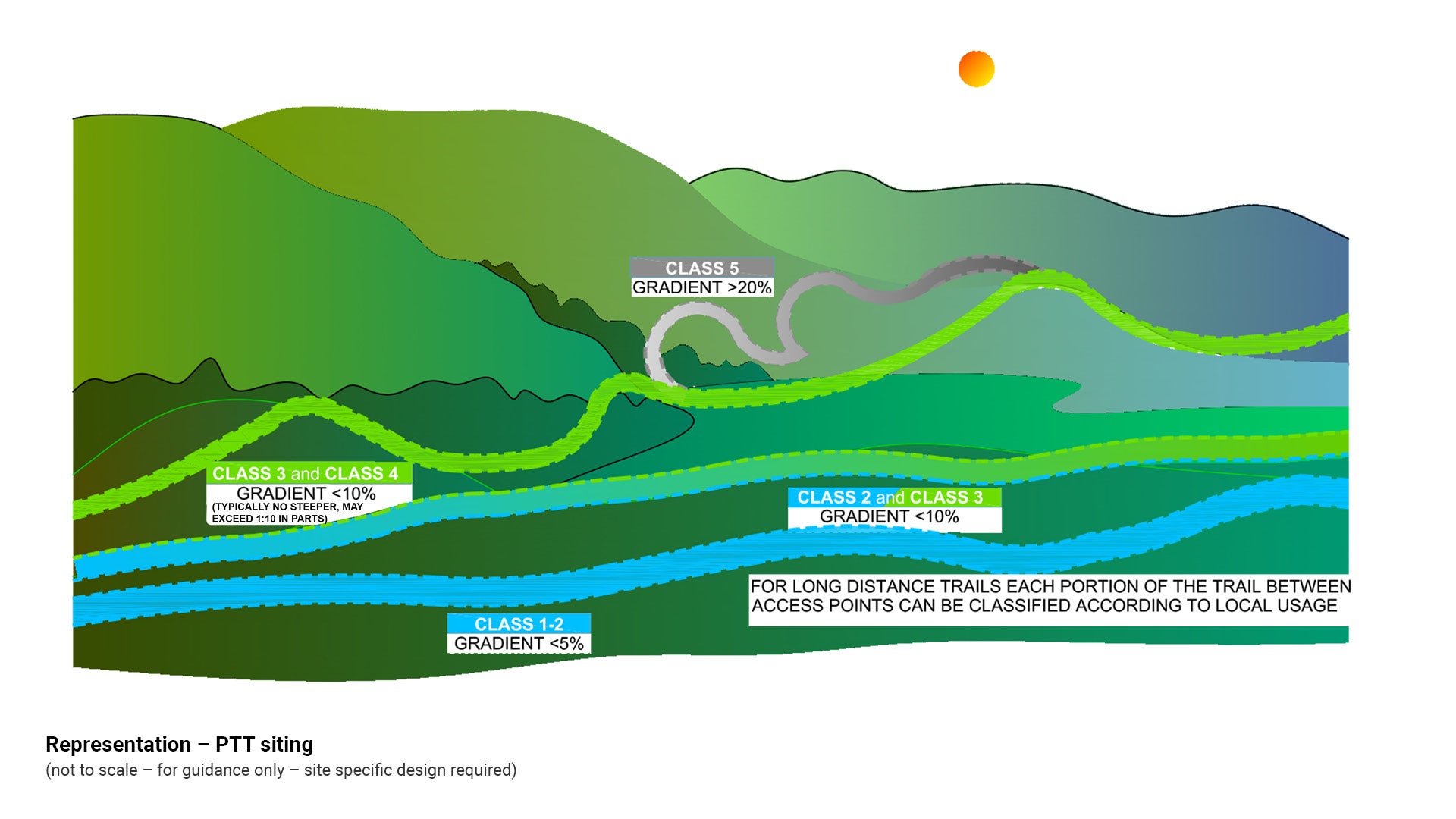Natural site gradient will assist in the determination of the path/trail/track (PTT) classification. Consider all factors such as user catchment type, user statistics and future area potential.