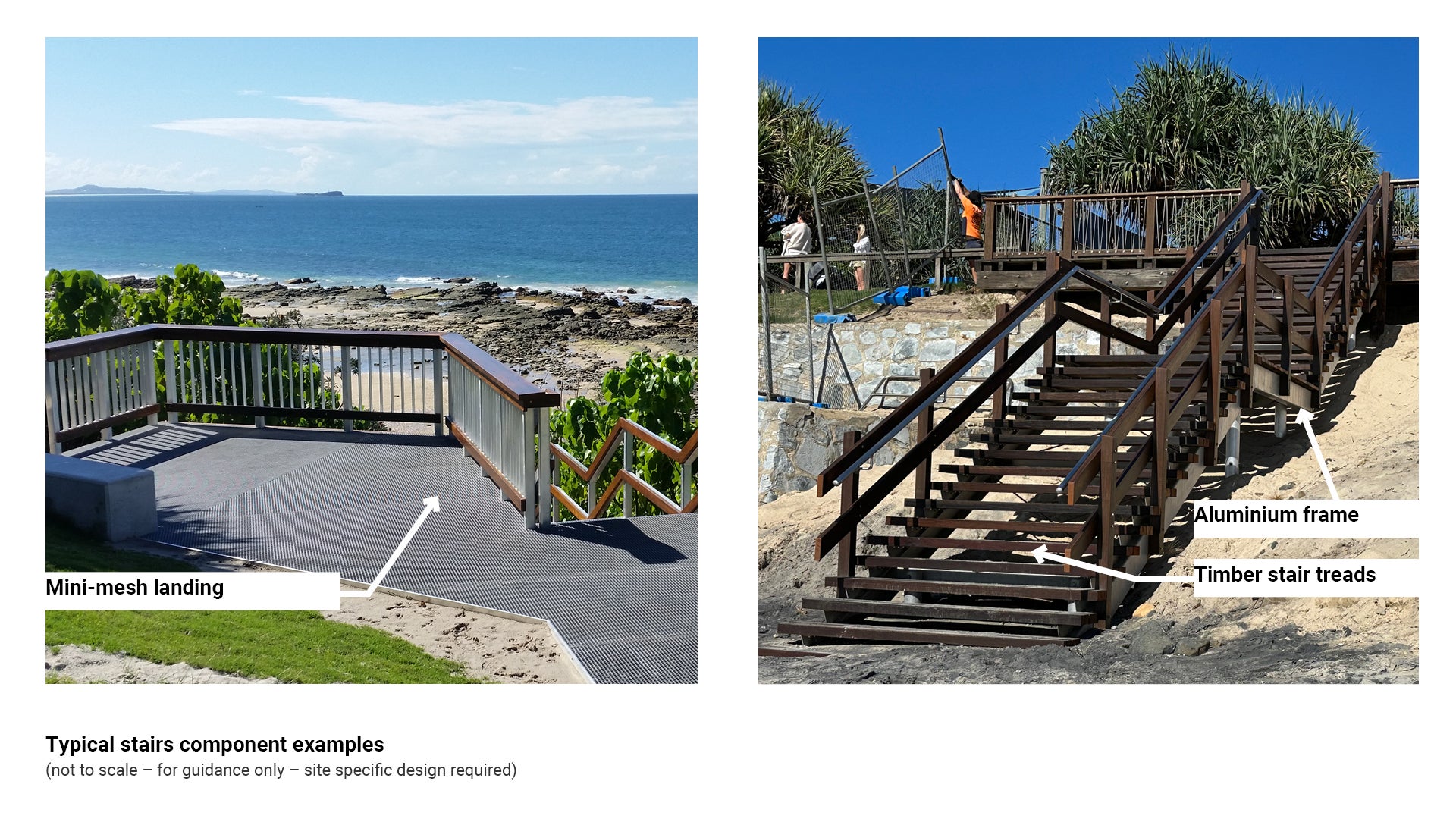 - Desirable widths – typically relaxed stairs are preferred in public spaces for best comfort levels, however when it comes to beach stairs, it is important to use as little footprint area as possible to reduce the dunal area impact and below ground interference. Using a relaxed stair design may result in metres of extra footprint - not desired. Use:
