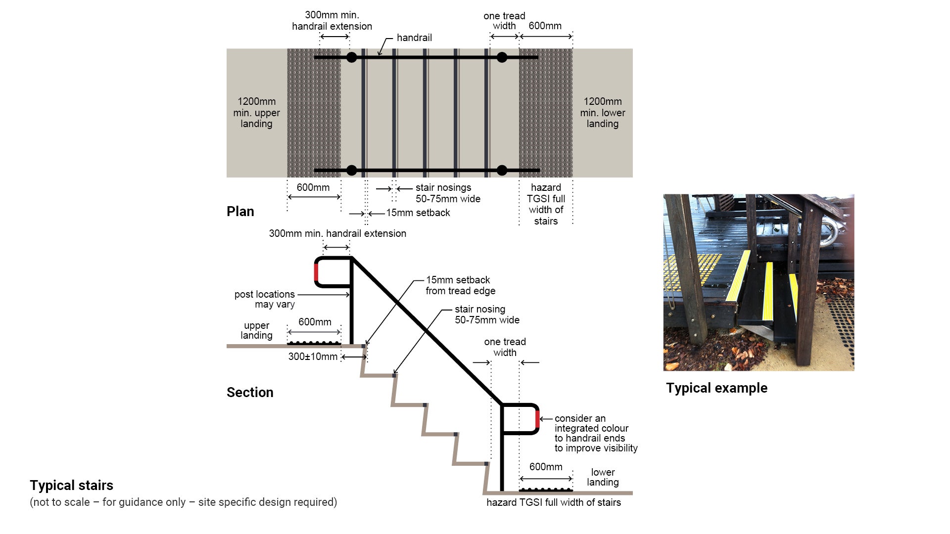 - Set stairs back a minimum of 900 mm from a building boundary so that handrails and TGSI do not protrude into a perpendicular path of travel.
