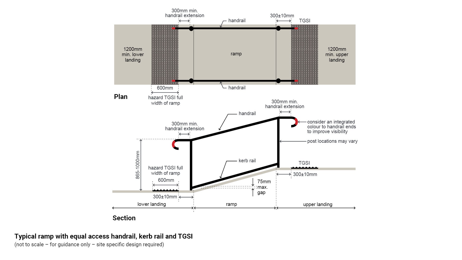- Figure 1: Typical ramp with equal access handrail, kerb rail and TGSI.