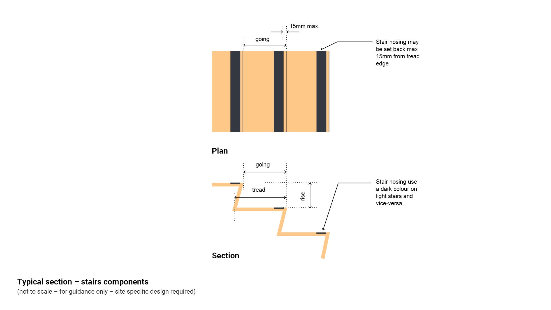 - Luminance contrast nosing strip for the full width of the stairs, 50 mm - 75 mm on the tread and 10 mm maximum on the exposed face of nosing strip.