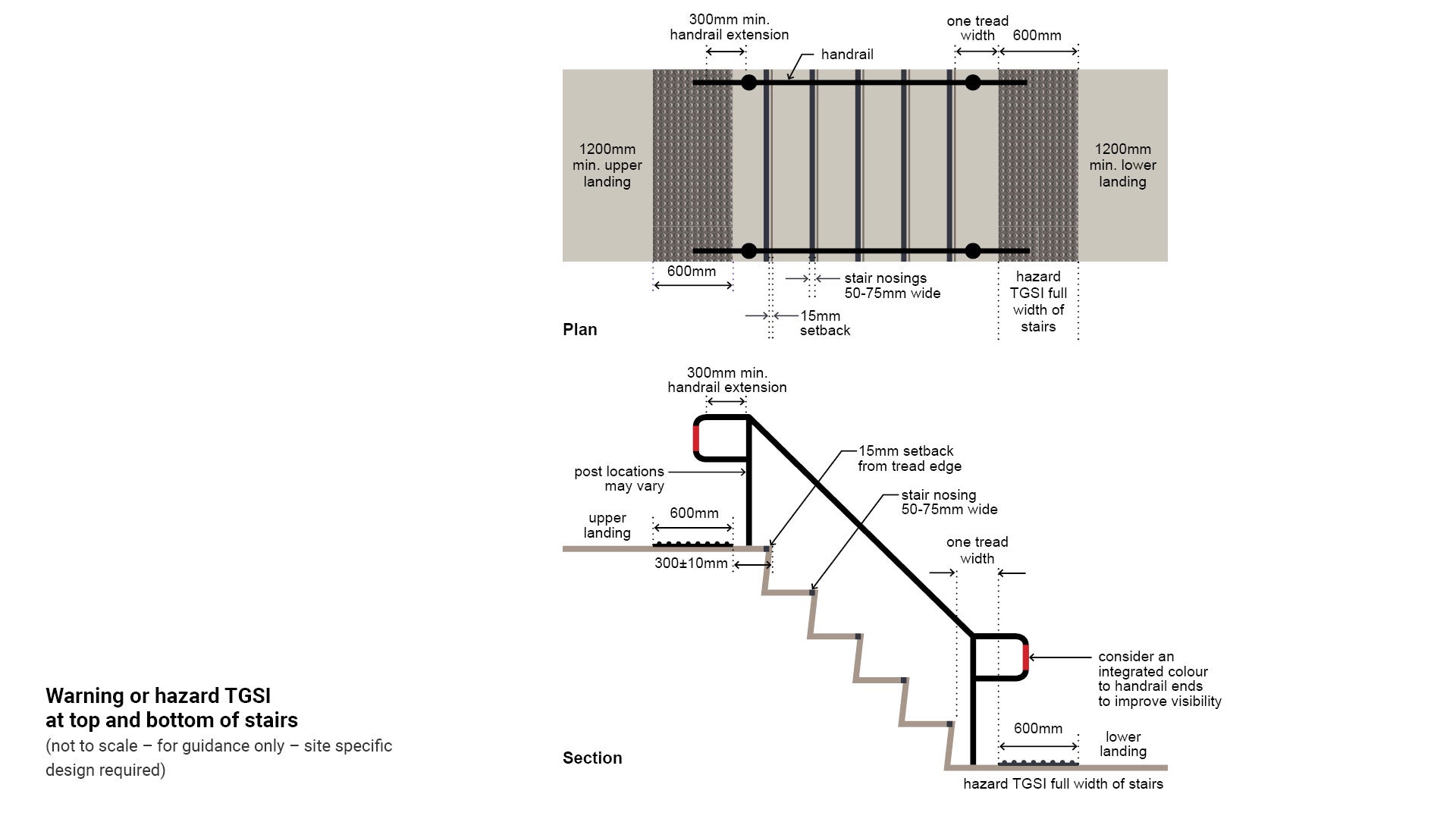 Note: Install warning or hazard TGSI to the top and bottom of stairs for a single set of stairs and where there are multiple sets of stairs with continuous handrail.