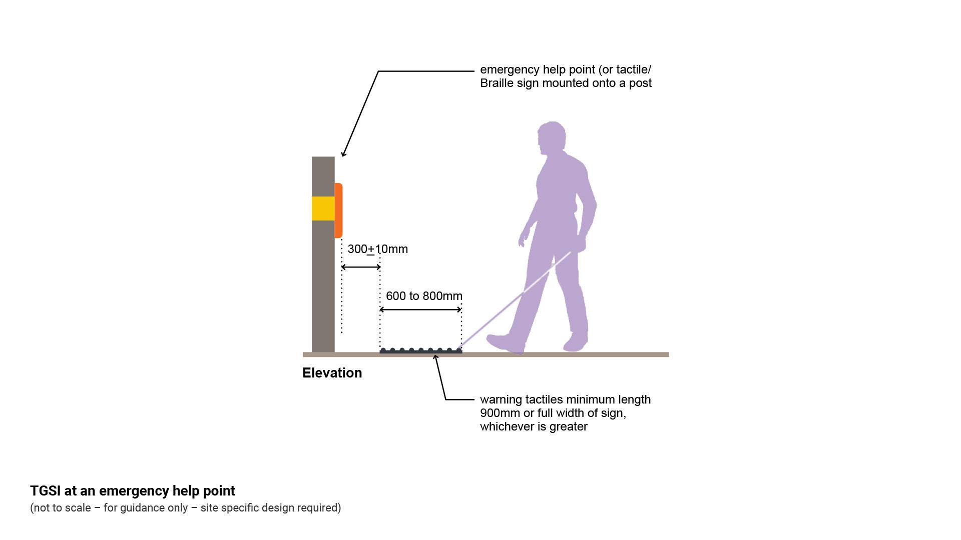 Hazard (warning) TGSI | Bollard (horizontal) | 300 mm | Alerts a VIP to the presence of the bollard (hazard). |