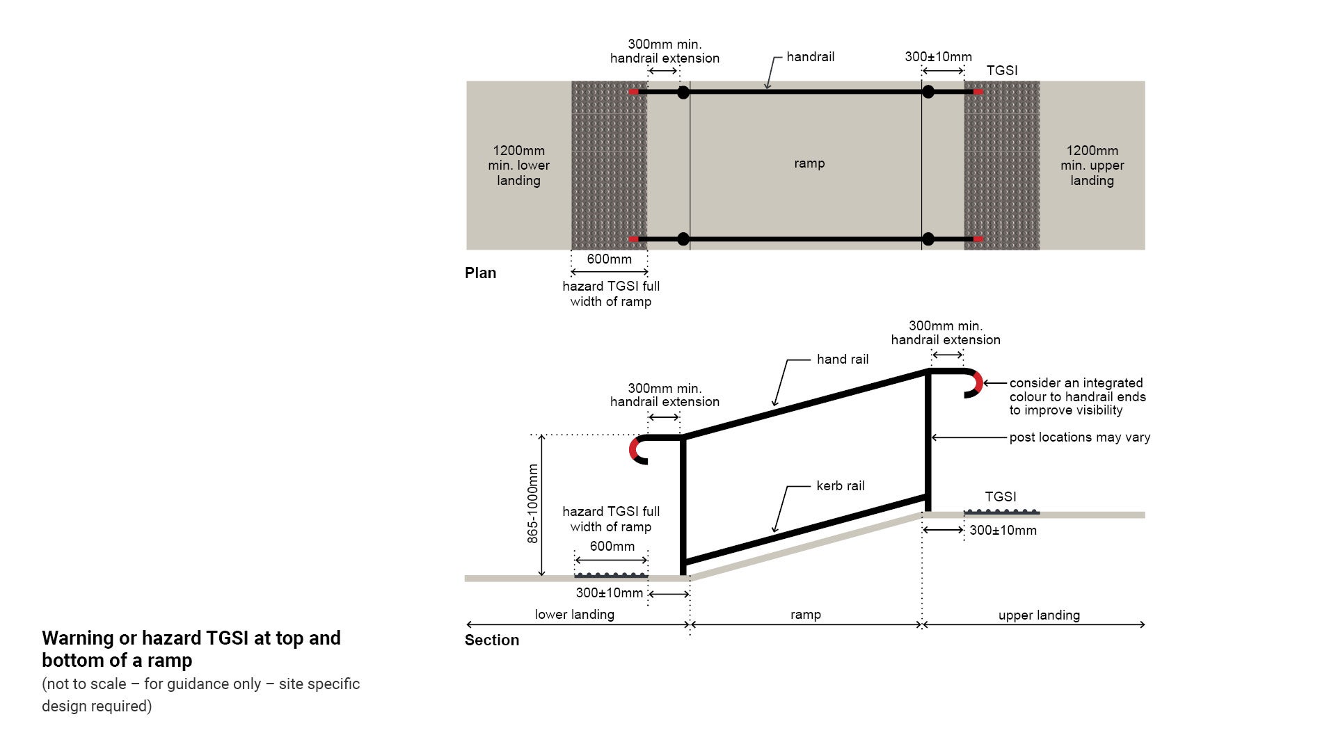 Note: Install warning or hazard TGSI to the top and bottom of ramps for a single ramp and where there are multiple ramps with continuous handrail.