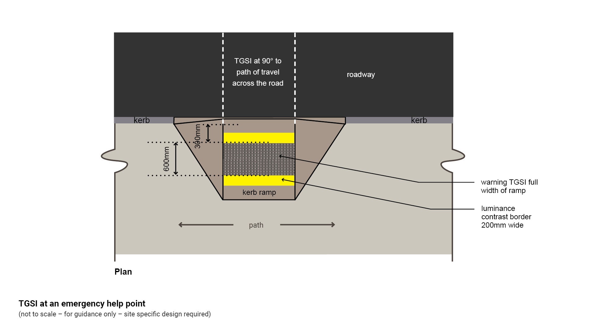 - Warning or hazard TGSI are required full width of a non-compliant kerb ramp at 300 mm offset from the road to alert VIPs about the impending road hazard.