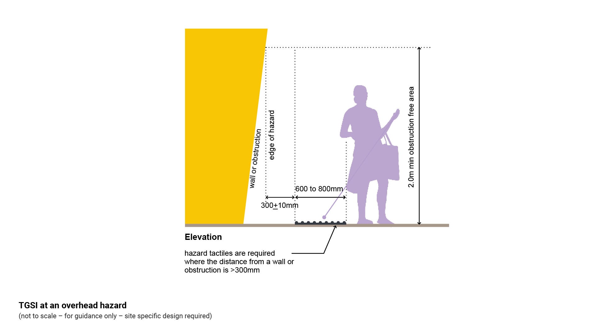Hazard (warning) TGSI | Any hazard (overhead) | 2.0 m | Alerts the VIP that there is a potential hazard beyond the TGSI band. |