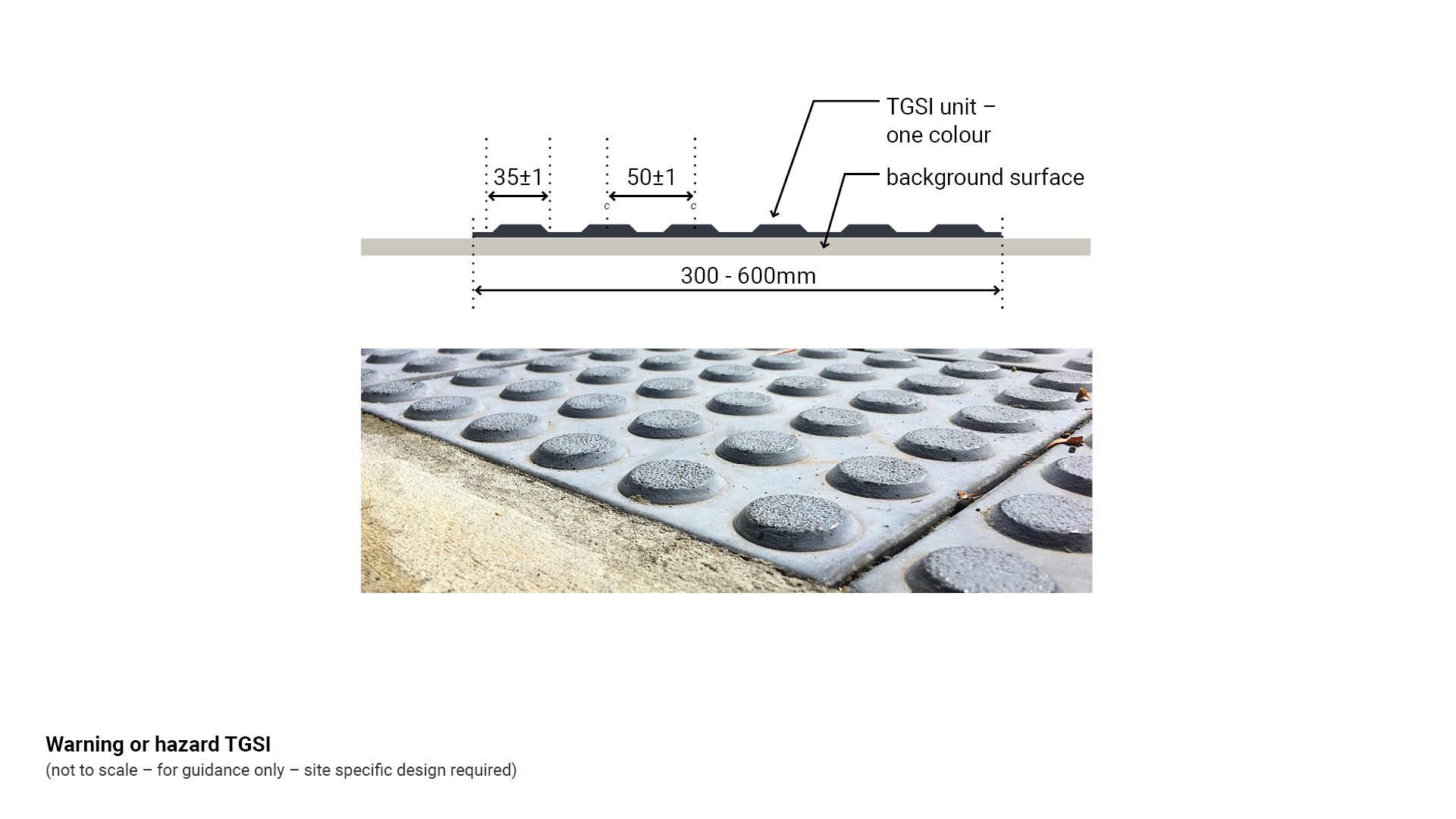 - Install warning or hazard TGSI 600 mm deep minimum, perpendicular to the direction of travel, to prevent a person with low vision from stepping over the tactiles.