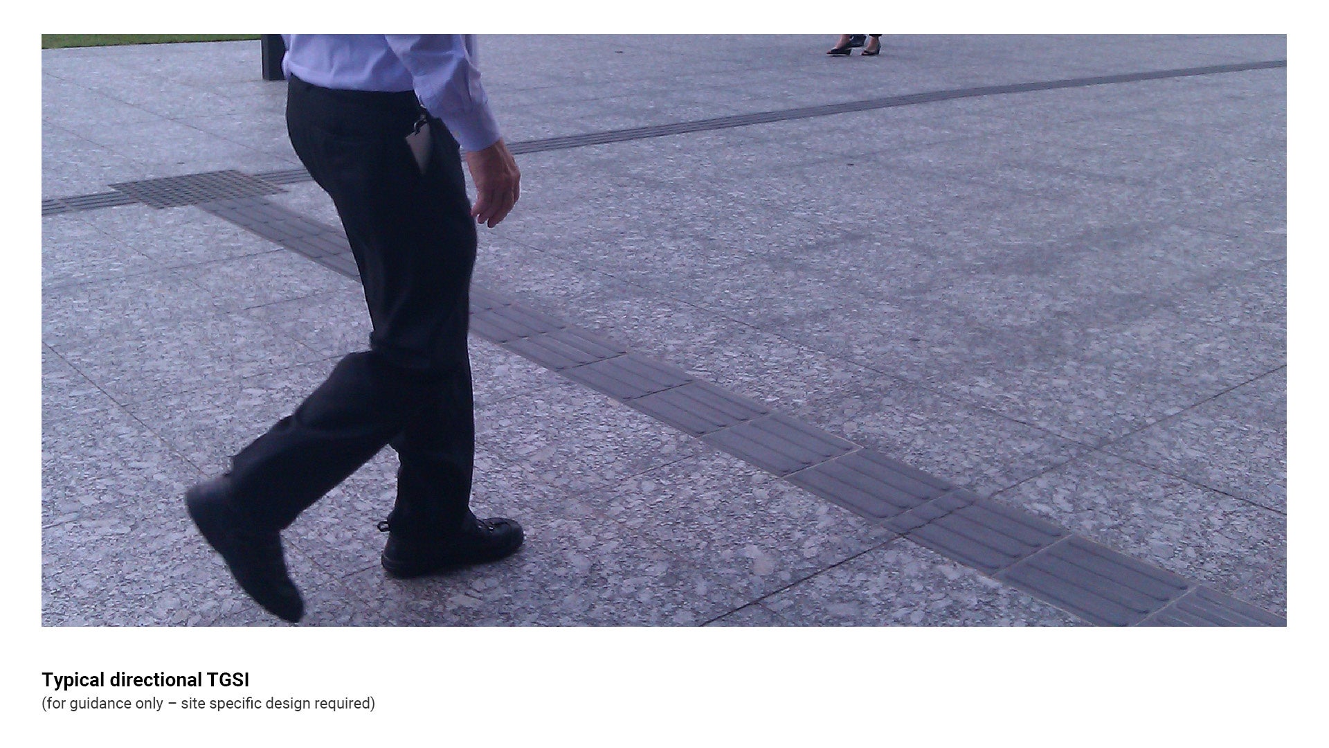- Install directional TGSI at 600-800 mm wide where the TGSI are perpendicular to the path of travel, to ensure that a VIP cannot step directly over the TGSI.