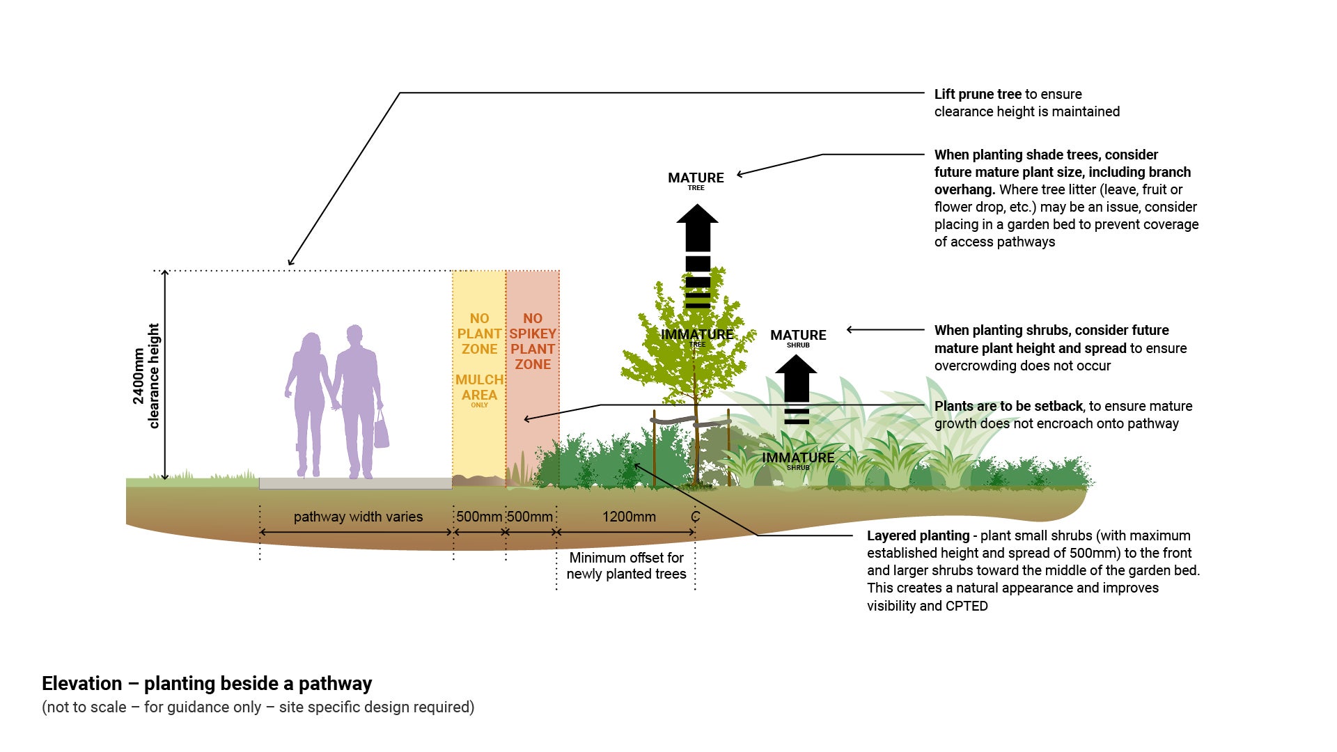 - No plants are to overhang any pathway below a 2.4 m clear height envelope as they may provide a hazard for tall or vision impaired persons.