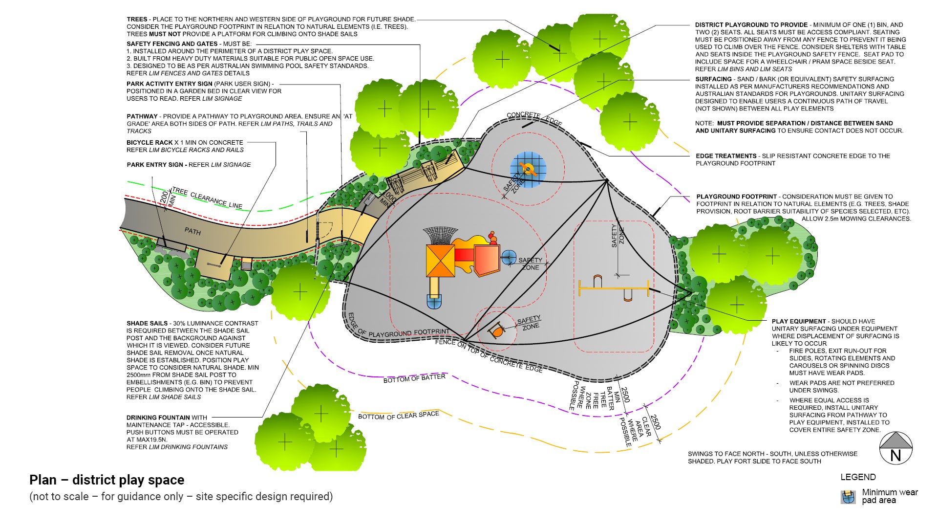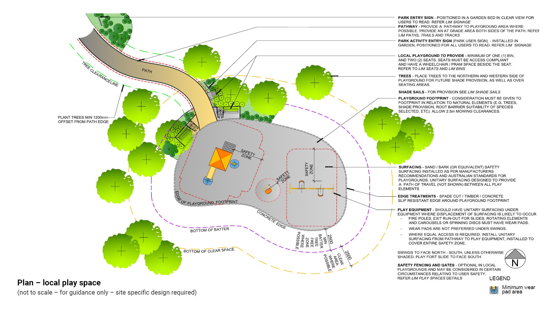 - Play equipment should be positioned with regard to sun exposure. Shade trees and shade sails are to be sited to ensure equipment is protected from the sun. For example: