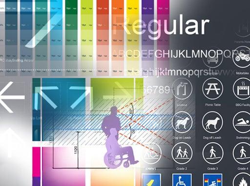 Corporate brand, Photographs and illustrations, Pictograms, Typography, Fonts, Arrows, Colours, Maps.