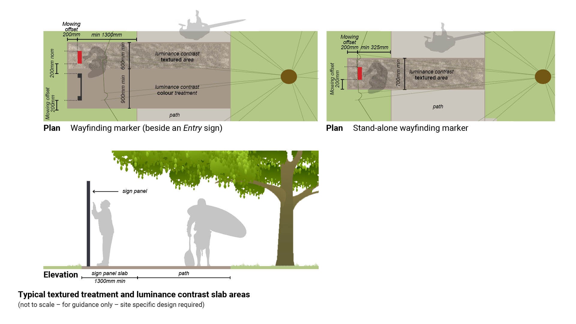 - A stand-alone marker requires a textured/coloured slab to be a minimum 700 mm wide. This allows a 200 mm mowing offset either side of the 300 mm wide Wayfinding marker - equal access.