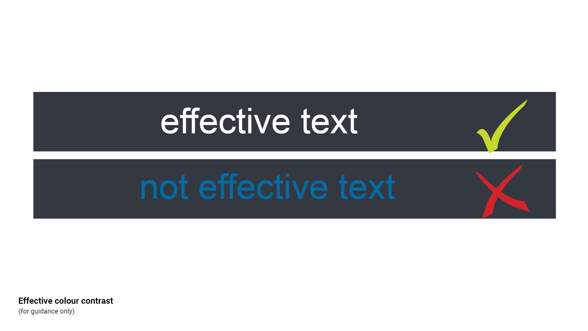 - Exaggerate lightness difference between foreground and background colours. Text should be printed with the highest possible contrast.