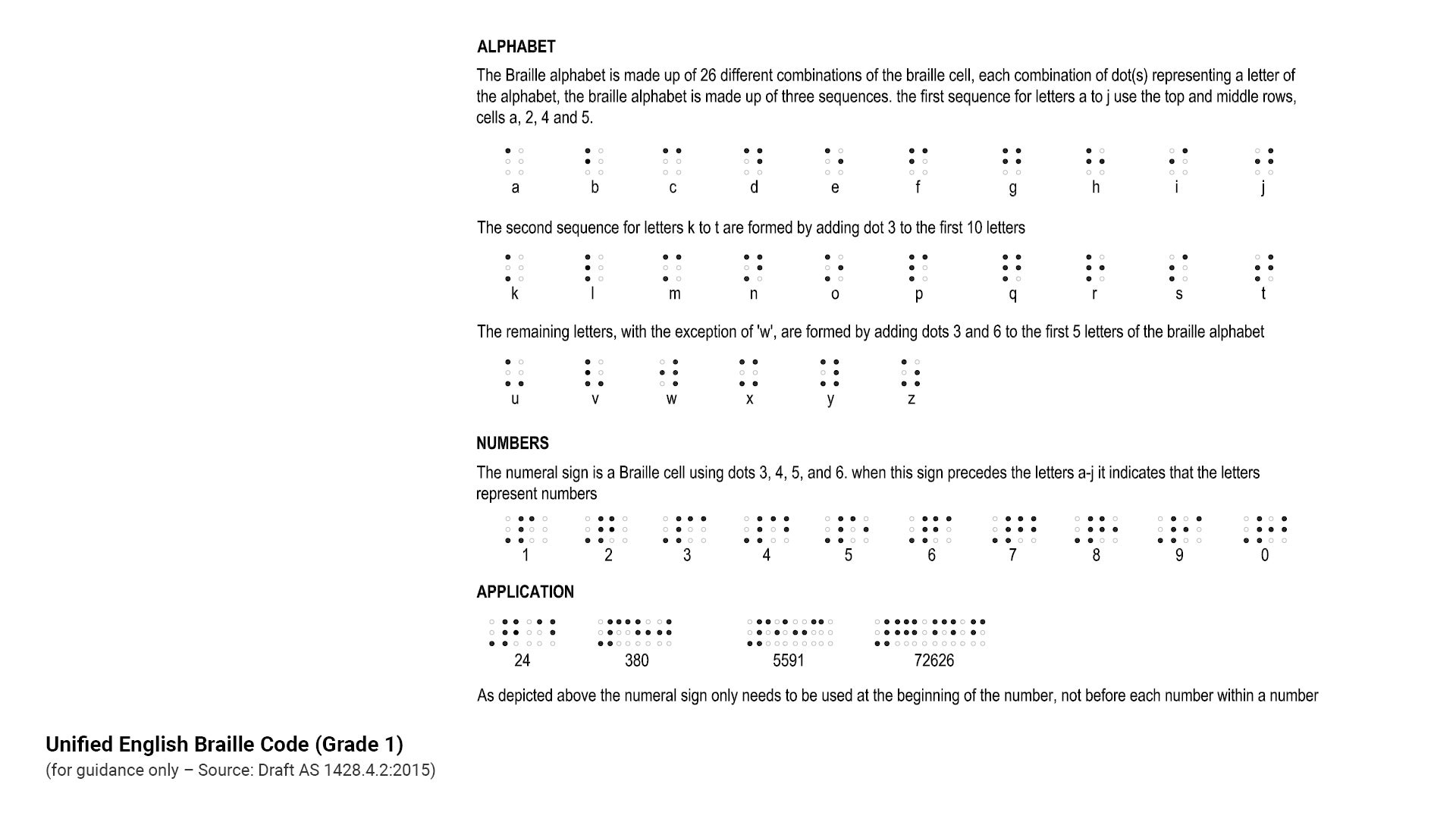 - Braille is to be Unified English Braille Code (UEBC) Grade 1. Ideally Braille should not have luminance contrast with the background it is viewed against.