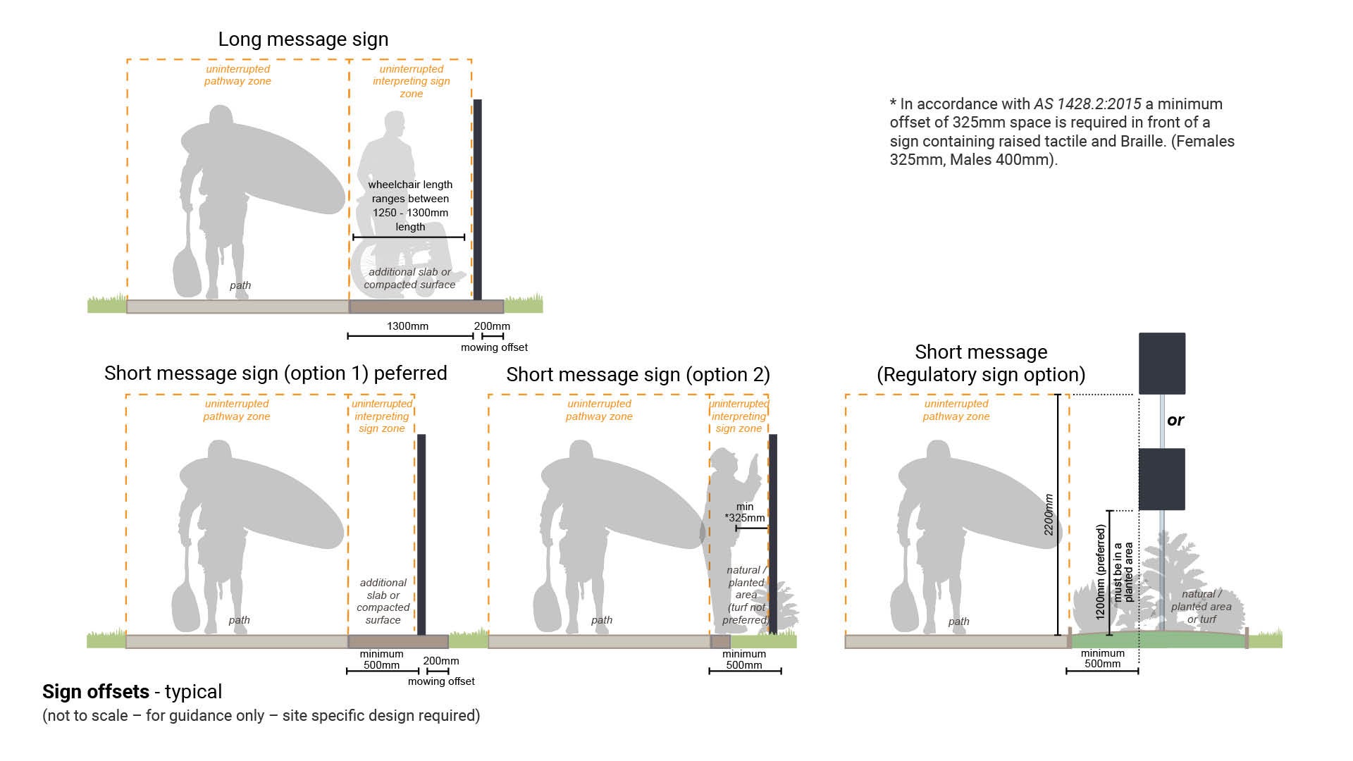 - Where a sign displays a long message, an appropriately sized additional slab or compacted surface treatment area minimum 1.3 m off the pathway should be incorporated into the design. This provides space for a wheelchair or group of people, to position in front of the sign while not obstructing other path users. Long message sign examples are pedestrian entry, Map and information (trailhead) map and interpretive signs.