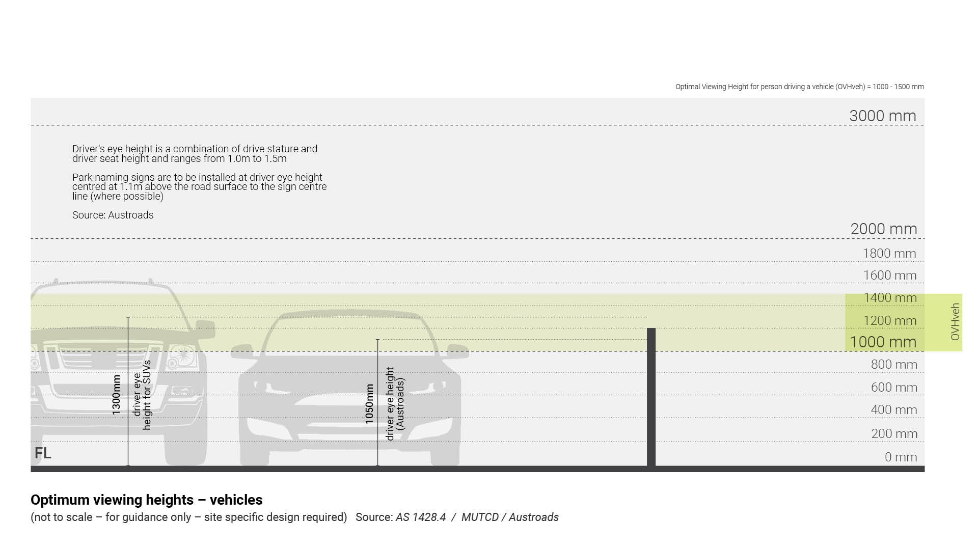 - These signs will be positioned using the optimum viewing height of between 1.2 m – 1.7 m above finished ground level.