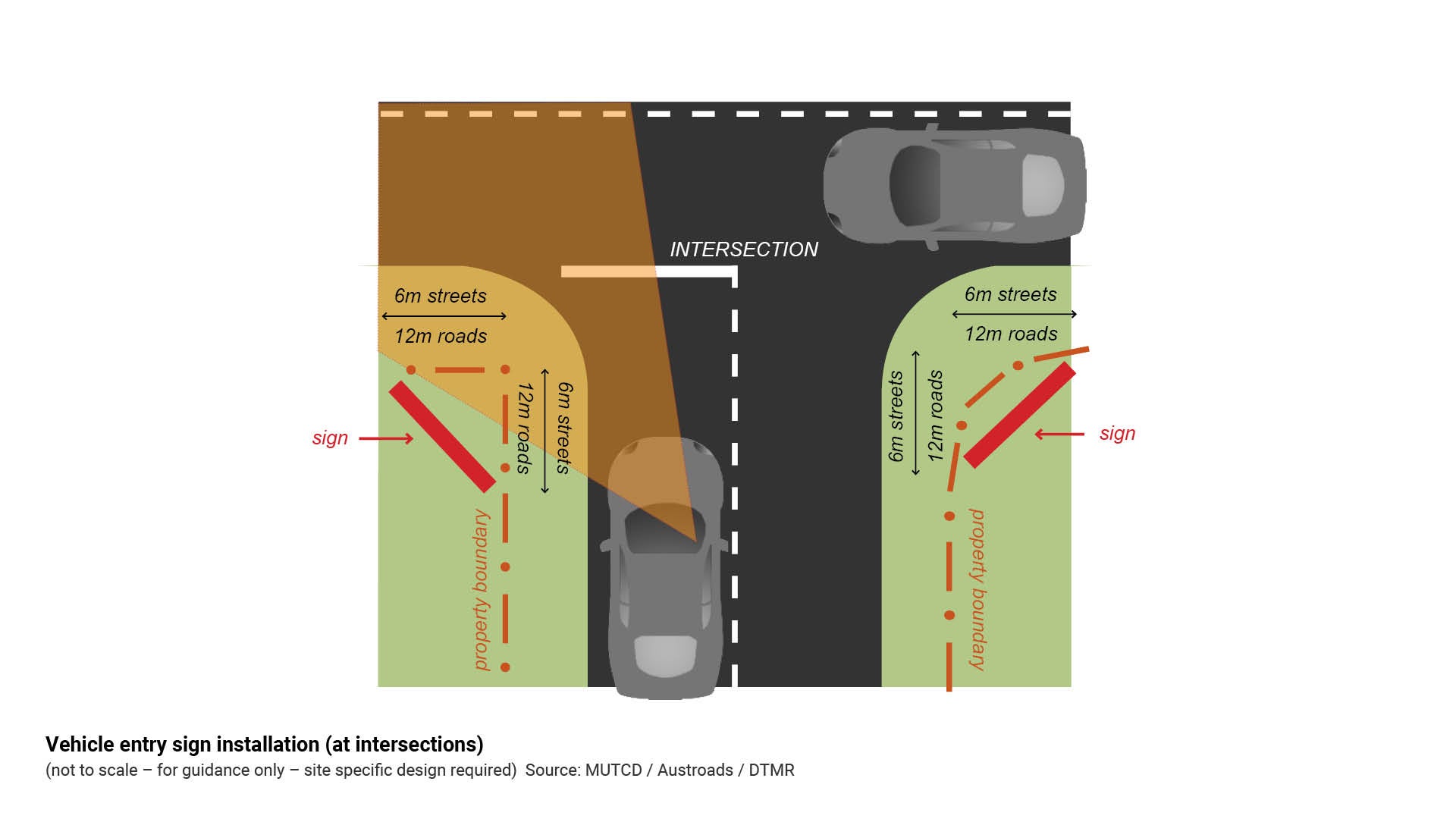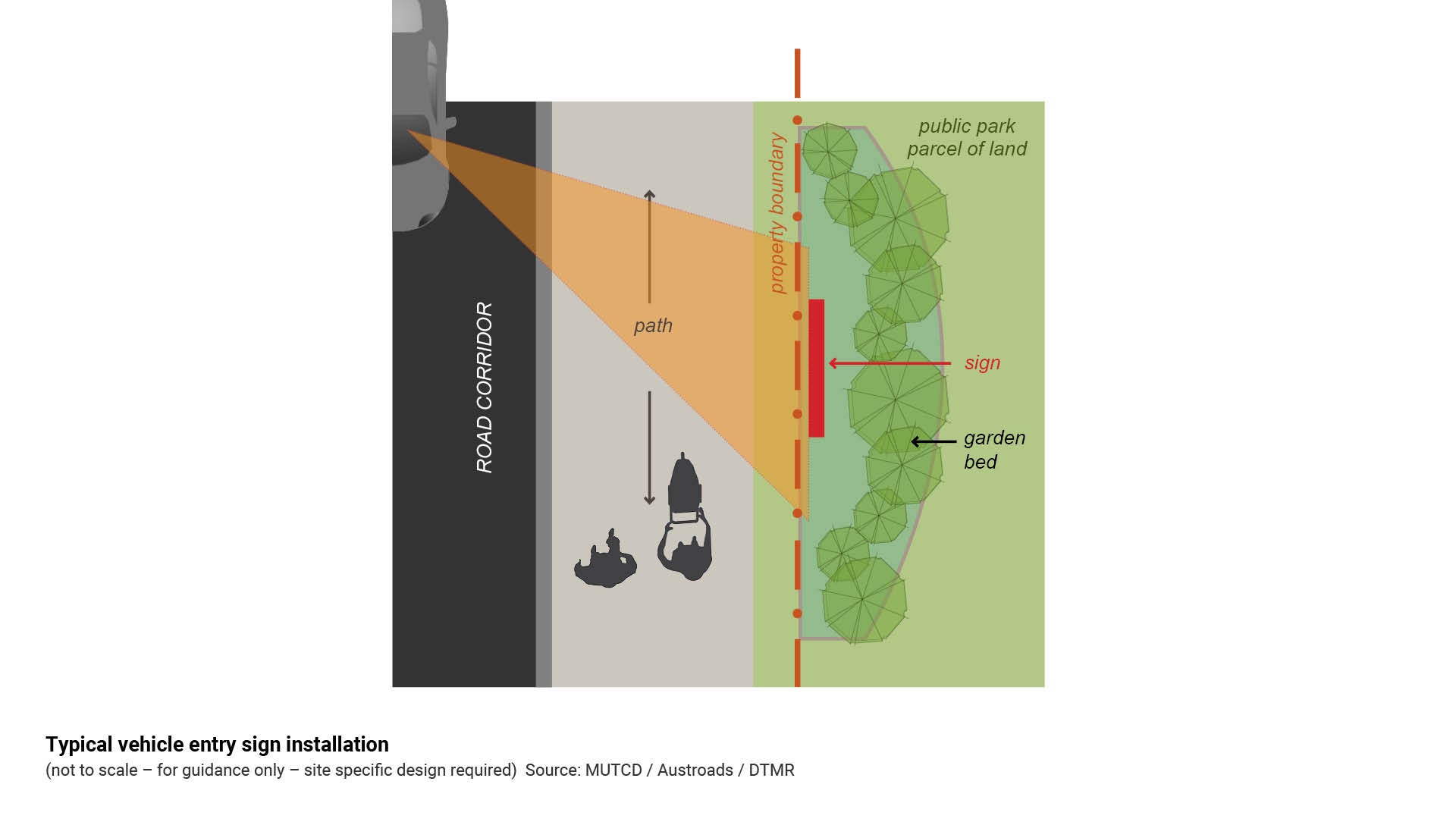 Note: The vehicle entry signs are NOT designed to be installed within a road reserve. The sign is designed to be installed inside the property boundary. Where the sign is installed within a road reserve, the sign must comply with the MUTCD and DTMR Guide to Roadside Signs.